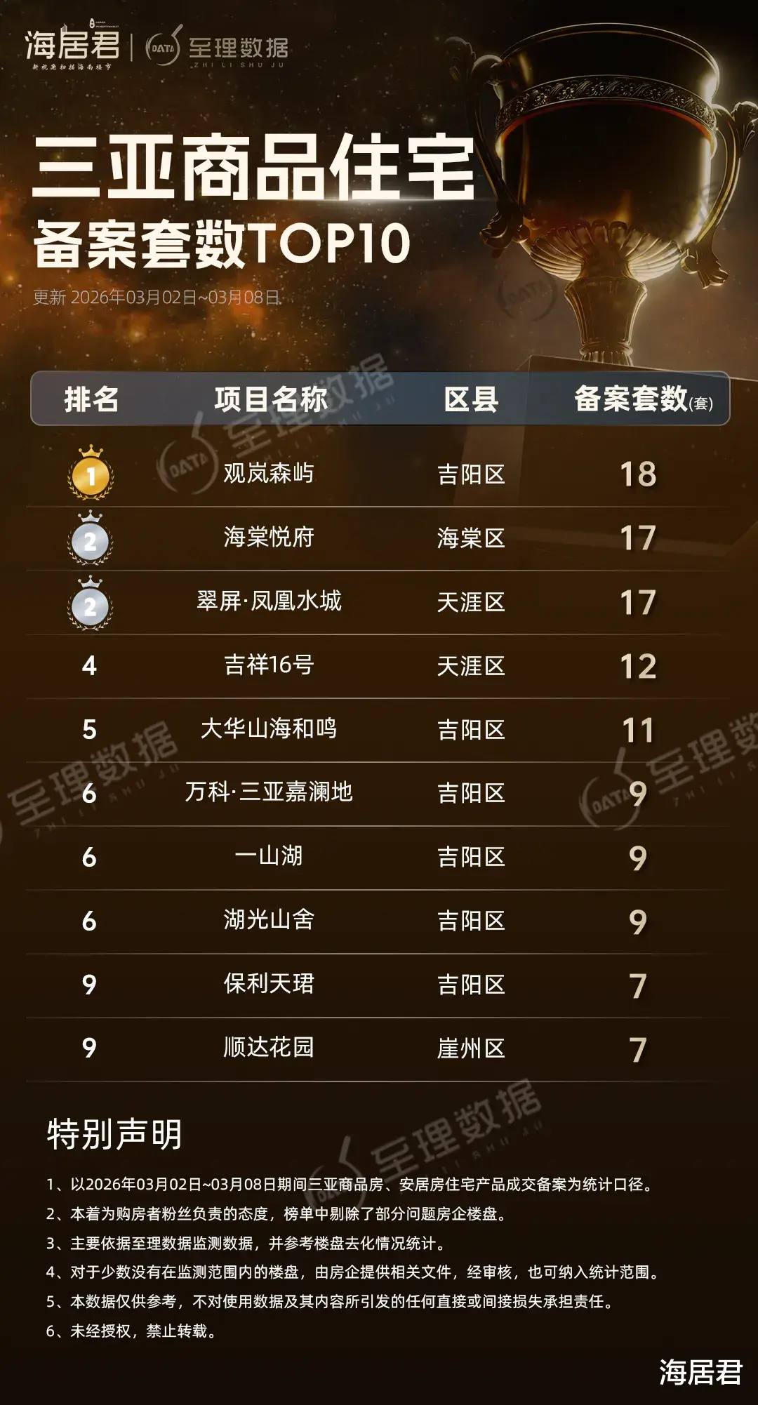 海罗片区观岚森屿集中成交备案18套,跃居榜首;海棠湾的海棠悦府、中心城区的翠屏·凤凰水城均成交备案17套,并列第二位。