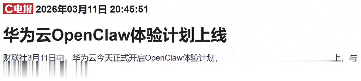 1)3月11日,华为云 OpenClaw 体验计划宣布上线,支持用户将 AI 智能体部署在云端,通过与本地隐私数据隔离,实现更安全的“养虾”体验。