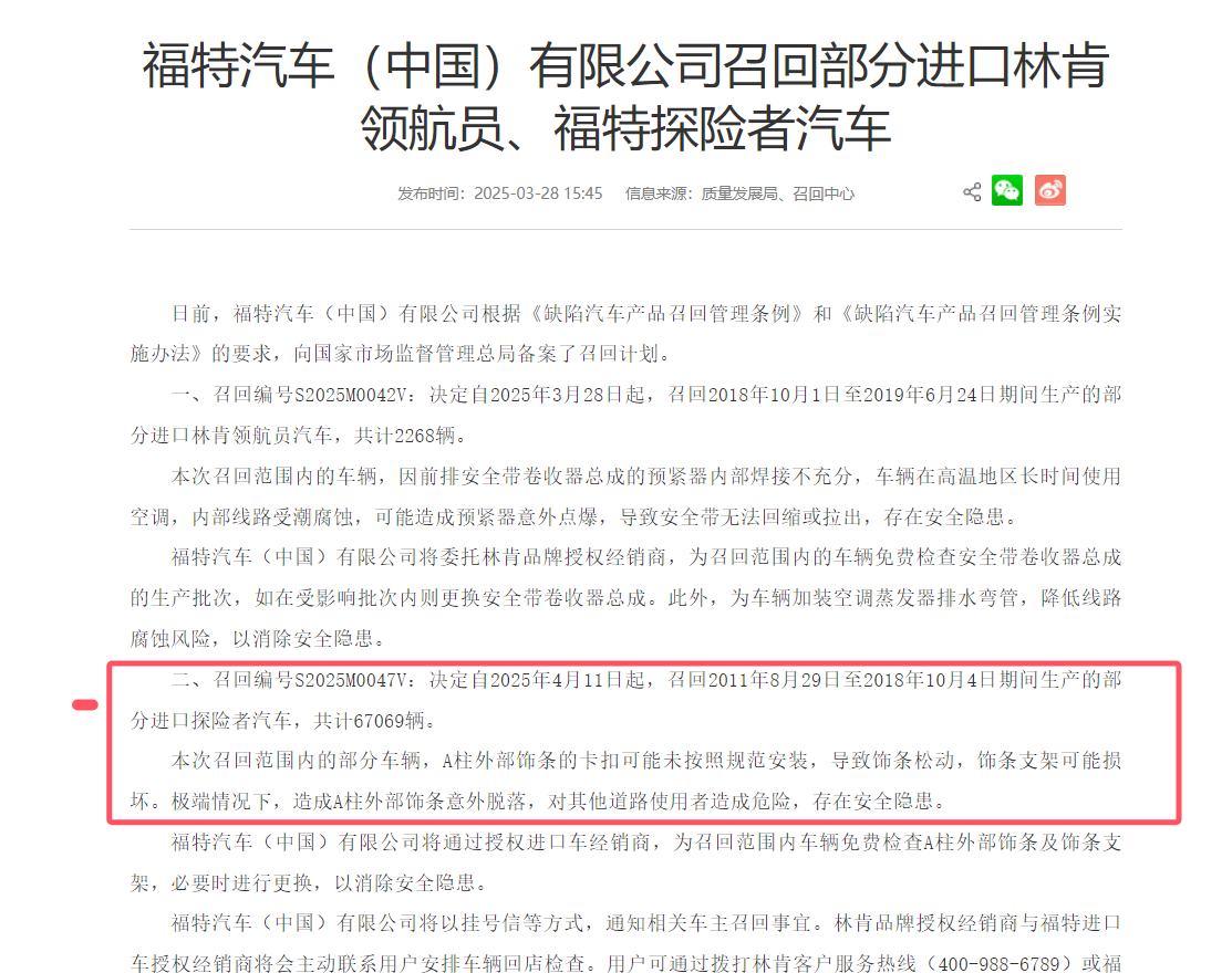 召回之后,福特方面将会通过授权进口车经销商,为相关车辆免费检查A柱外部饰条及饰条支架。