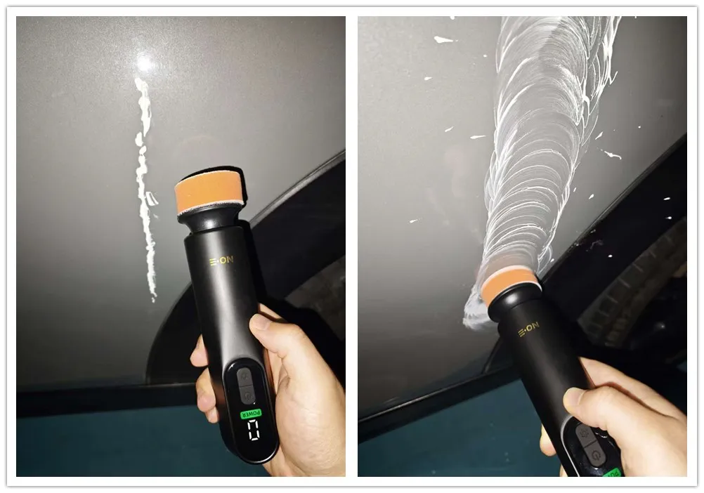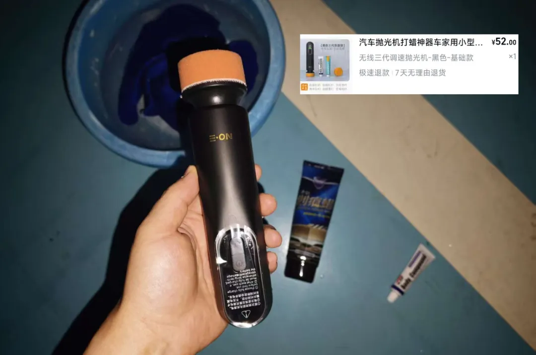 别人靠不住,还要靠自己,于是在某宝搜了一下小型抛光机,从一堆品种中买了个52元的手持无线式,送一管研磨剂和一管油膜去除剂,加上我自己祖传的划痕蜡(还是十年前开蒙迪欧买的),唱着歌就去车库干活了。