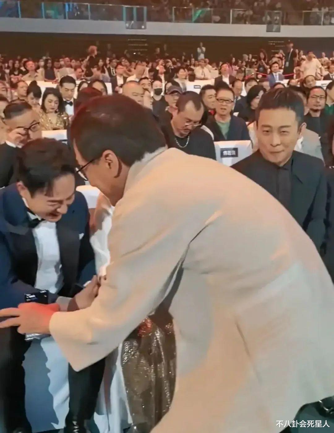 和张译握手的时候,张译主动站起来了,但成龙还弯腰比他还低。