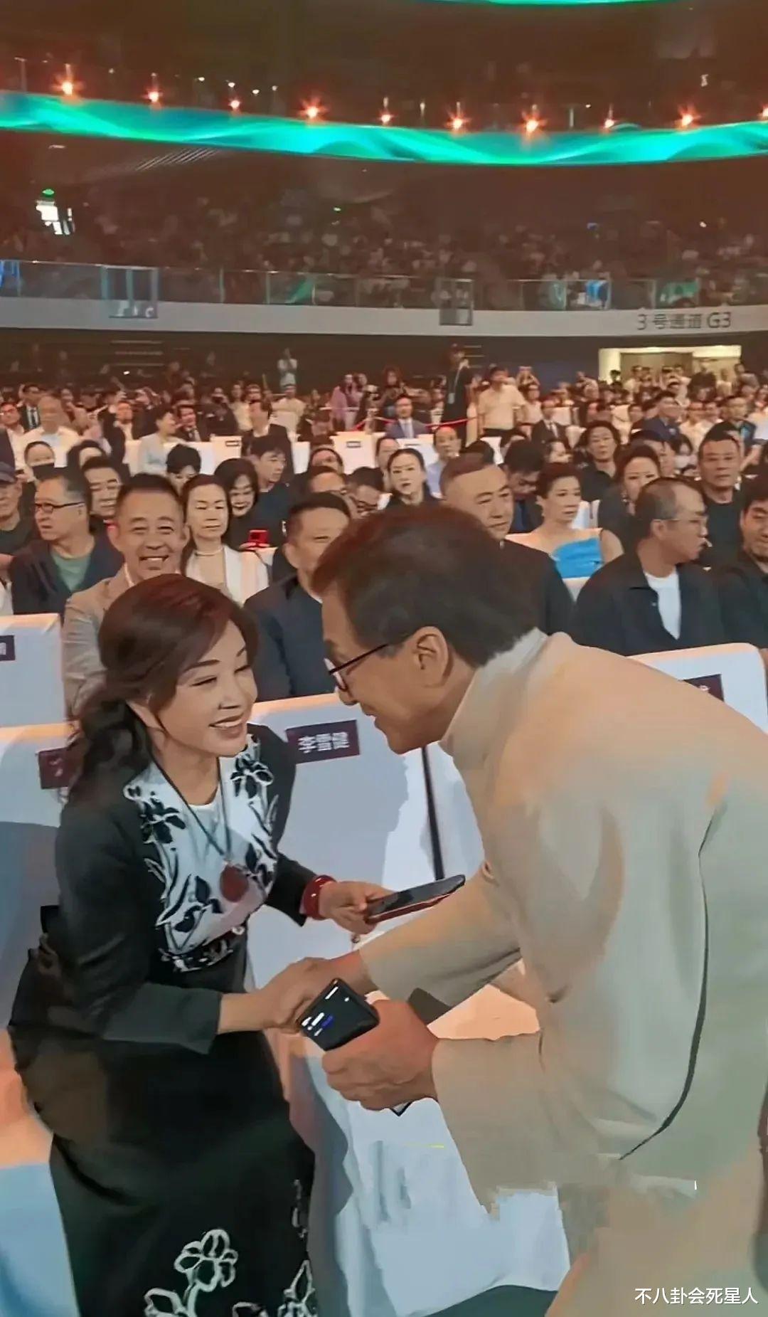但也有几位明星并没有起身的动作,像殷桃和张颂文就是坐在位置上和成龙握手的,不知道是不是因为来不及起身。