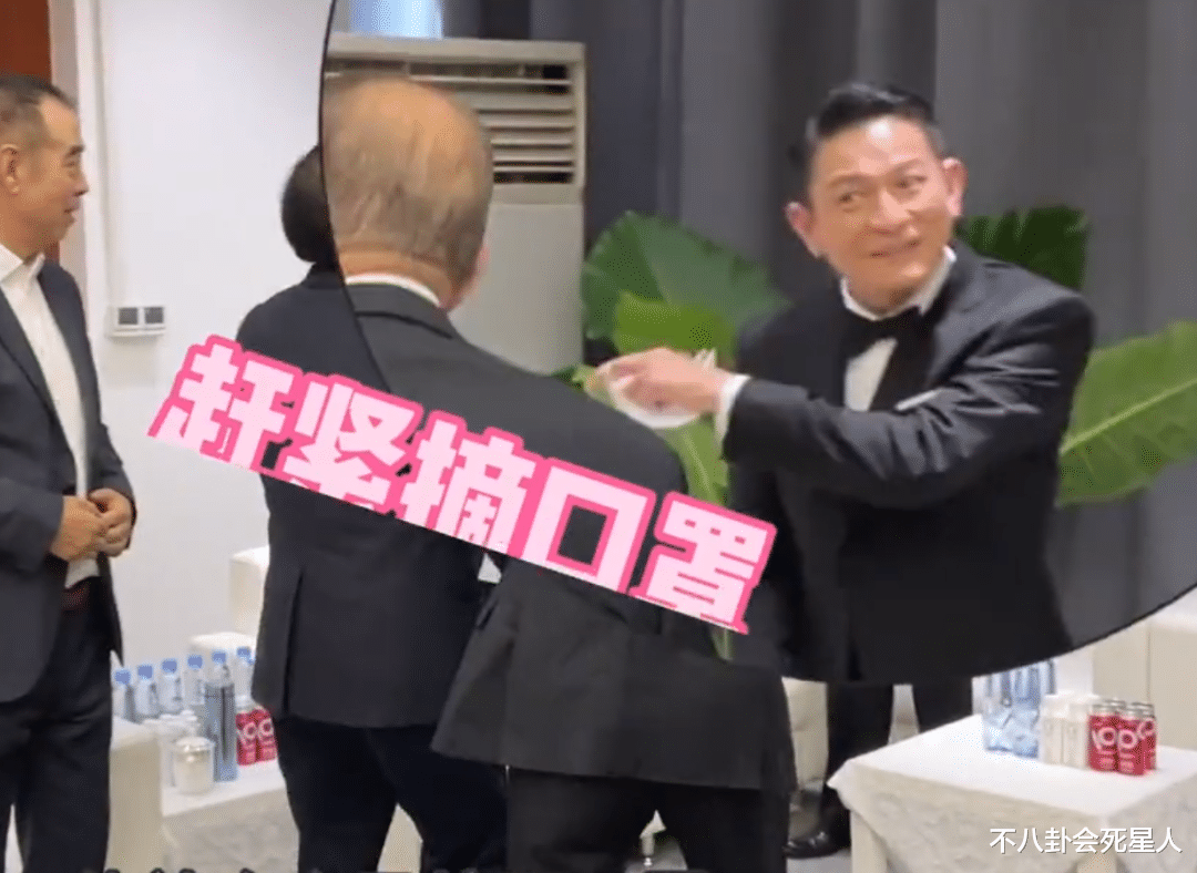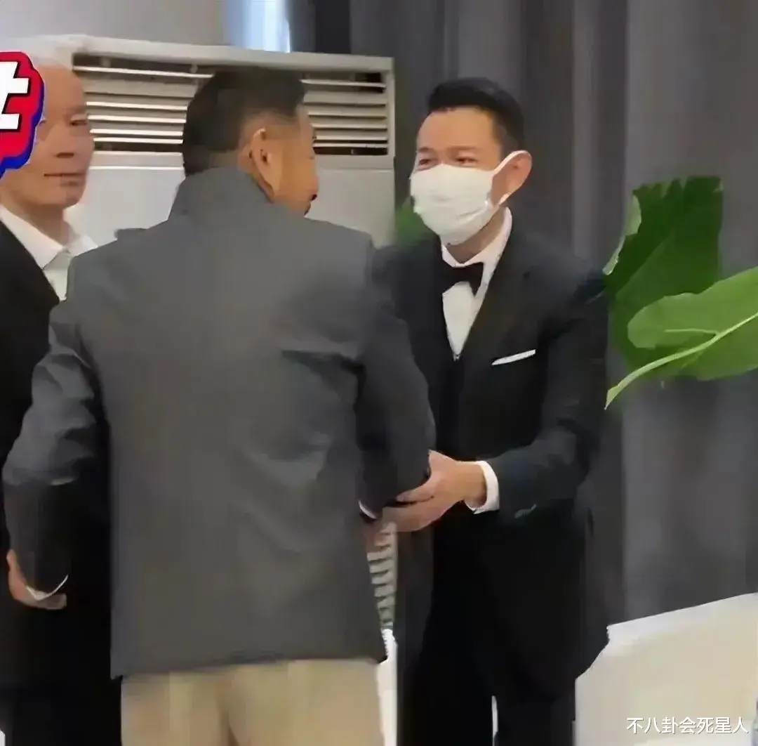 刘德华面对一众内地明星也不敢坐下,双手交叠局促站在旁边等待,有人走向他时立马摘下口罩握手打招呼。