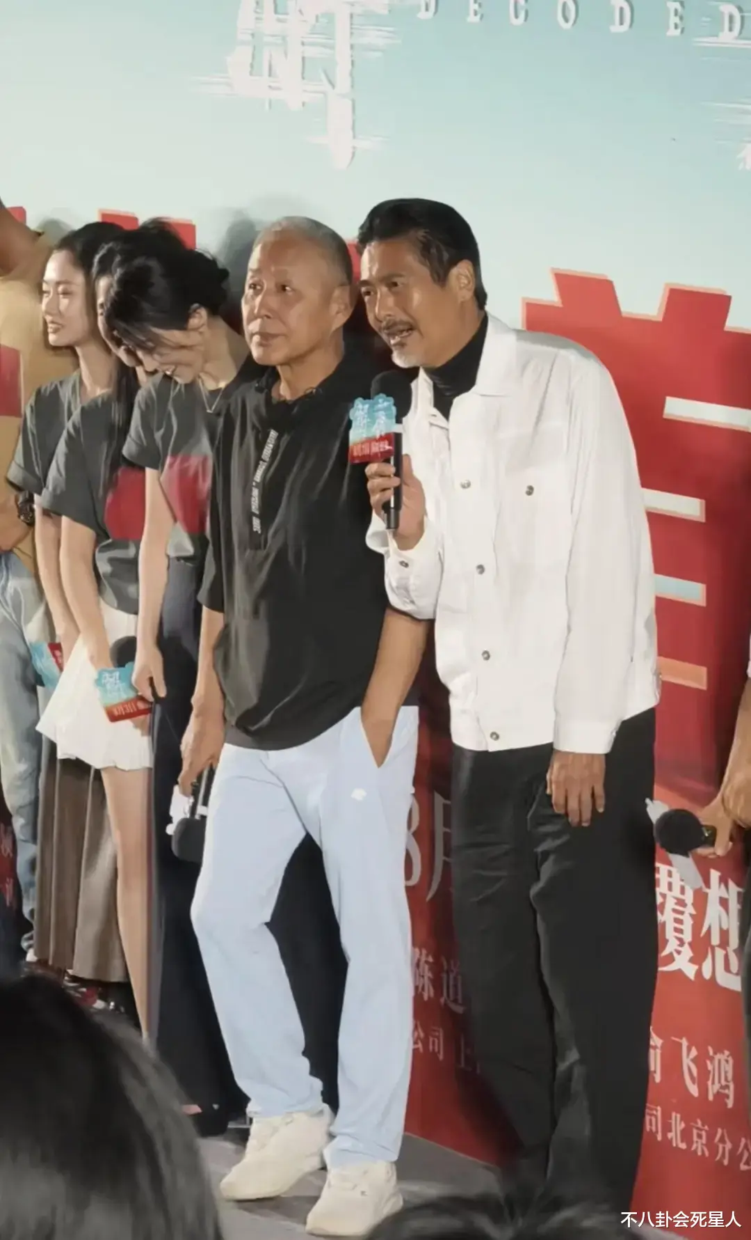 相反,站在周润发身边的陈道明则站得笔直,单手插兜,不苟言笑的样子像极了“领导”。