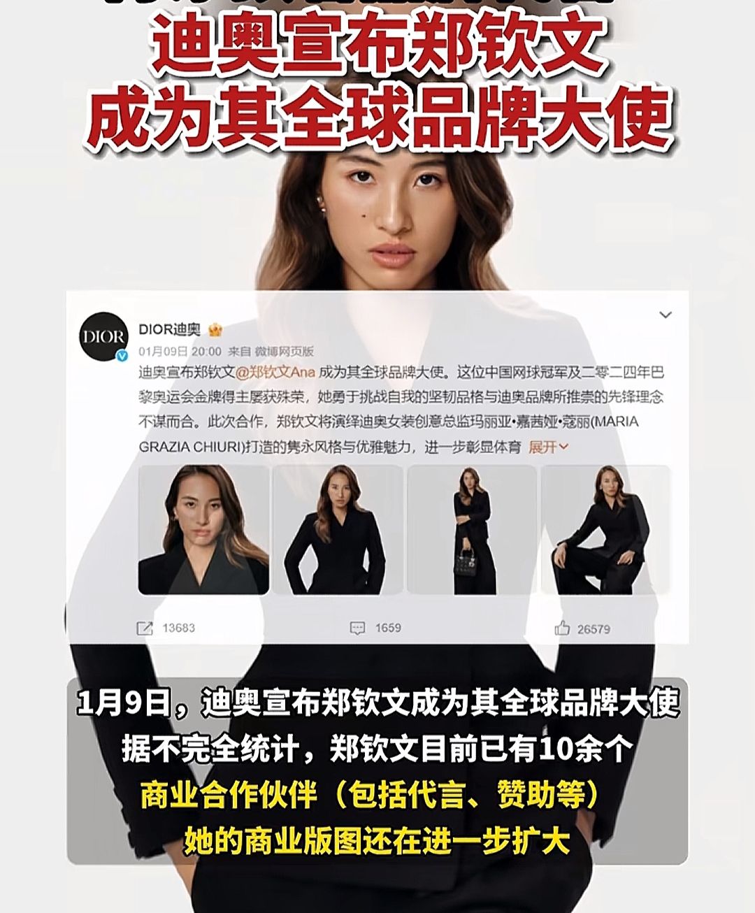 此外,她还成为了迪奥的全球品牌大使,这是该品牌首次与中国运动员合作。这些代言不仅提升了郑钦文的知名度,也大大增加了她的商业价值。