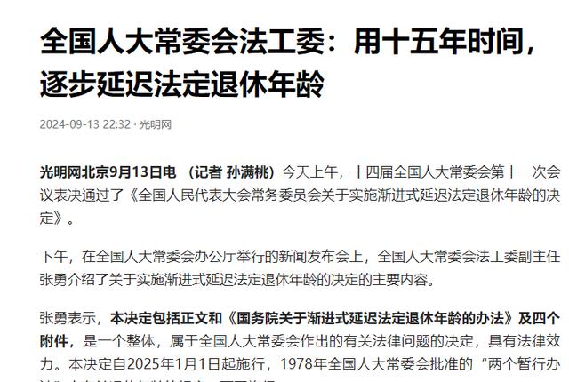 不过在这两年的发展当中,我国也是一直在就这个问题进行商讨,在2024年9月13日的十四届中国人大常委会第11次会议也是通过了《关于实施渐进式延迟法定退休年龄的决定》。
