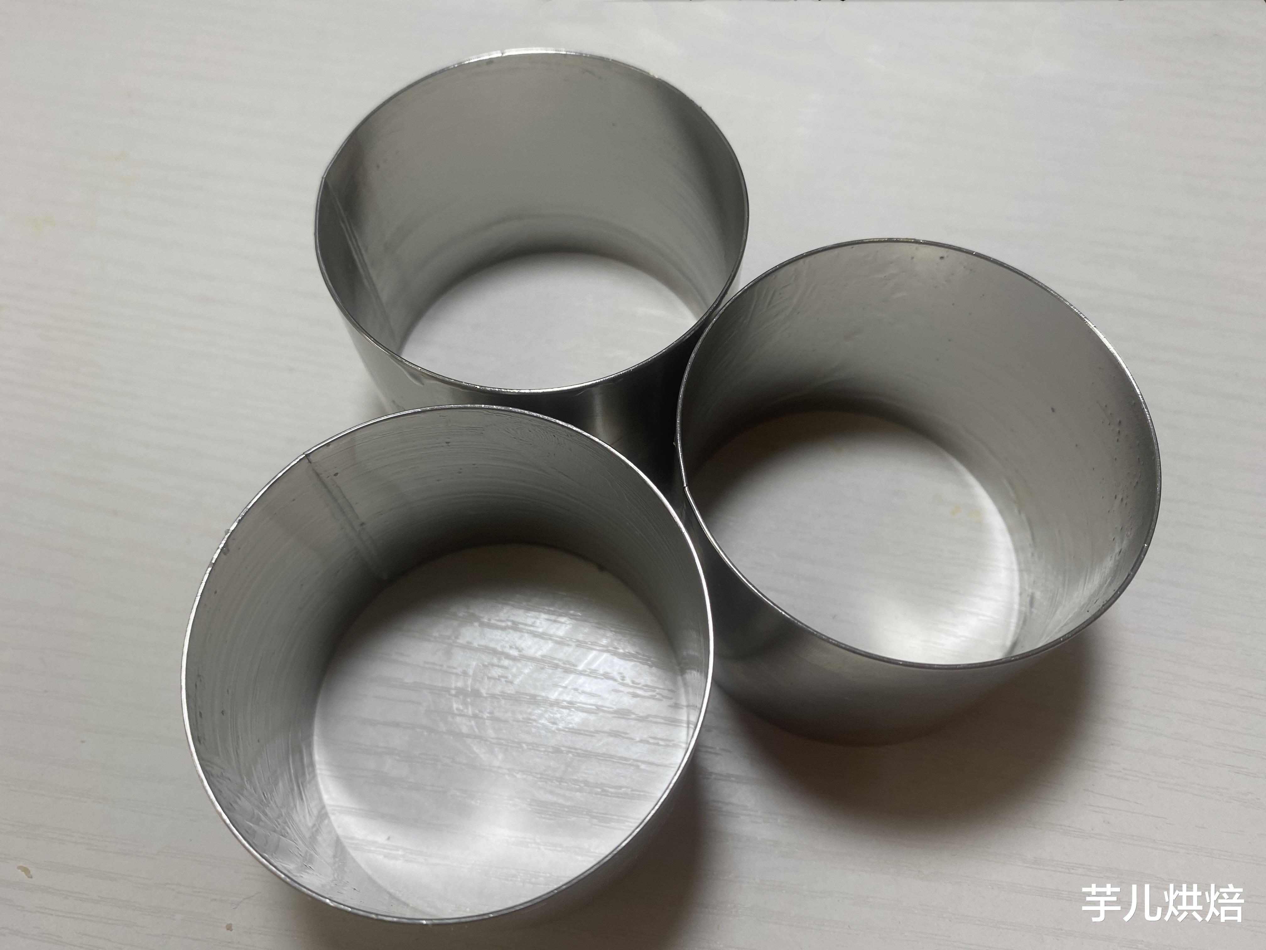 9.将模具提前抹油撒粉备用。没有模具可以直接用锡纸卷成5厘米高的圆形模具。