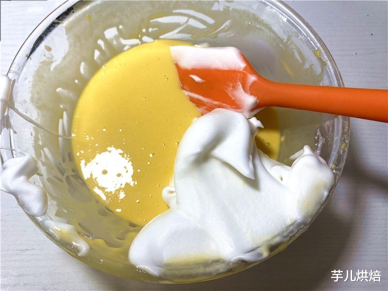 7.取三分之一蛋白霜入蛋黄面糊里,翻拌均匀。