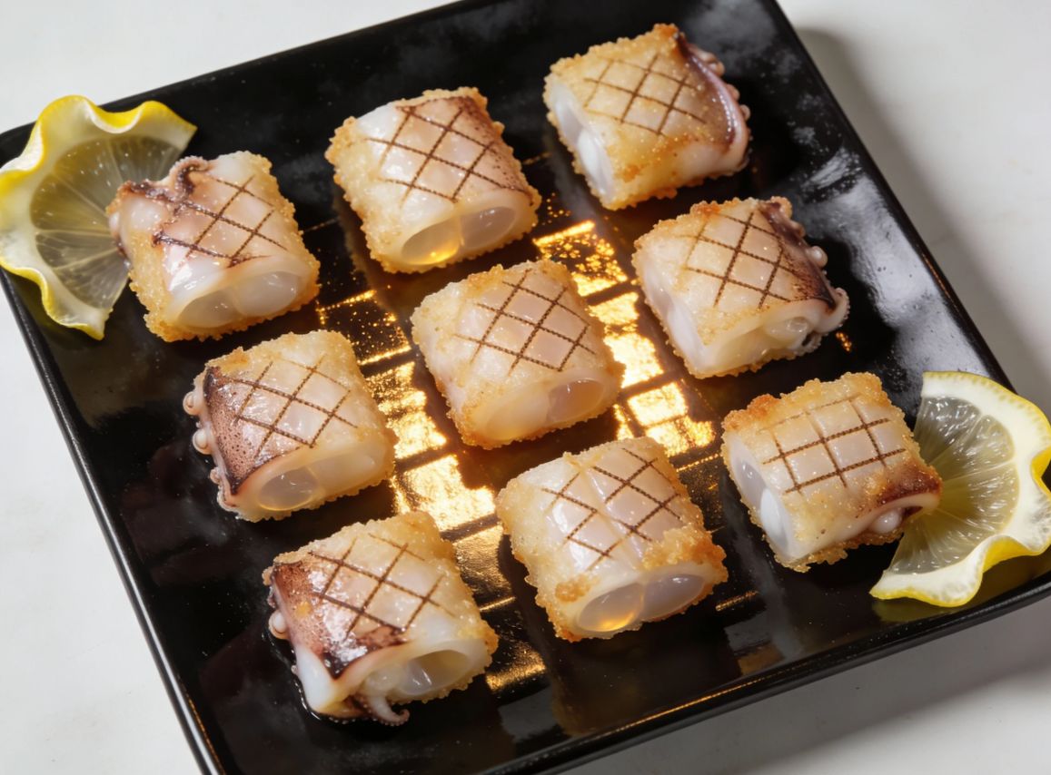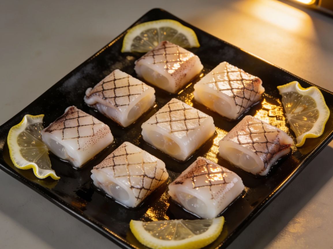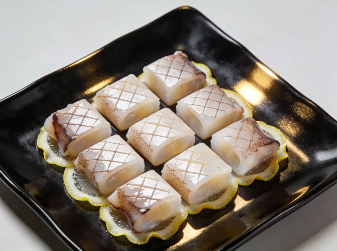 预处理之规:为达致“外酥内嫩”且形态美观,需在鱿鱼内侧肉质上剞出深度一致、间距约2.5毫米的十字花刀,再改刀成大小均匀的菱形块或长方块。花刀深度需切入四分之三,这是受热后卷曲成麦穗状、增大受热面积从而实现外酥内嫩的核心。
