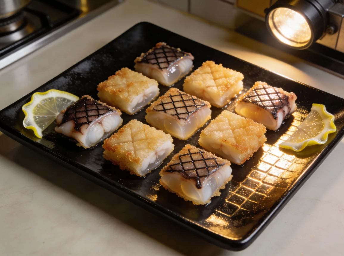 炸制:深锅烧油至190°C。将鱿鱼块分三至四批,单层下锅,炸25-30秒至卷曲、淡金黄,迅速捞出置网架沥油。
