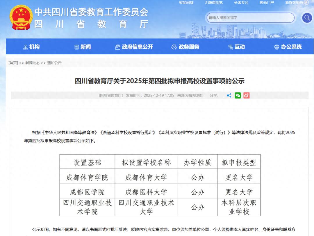 根据公示内容,成都体育学院拟申报更名“成都体育大学”,成都医学院拟申报更名“成都医科大学”,四川交通职业技术学院拟申报本科层次职业学校“四川交通职业技术大学”。