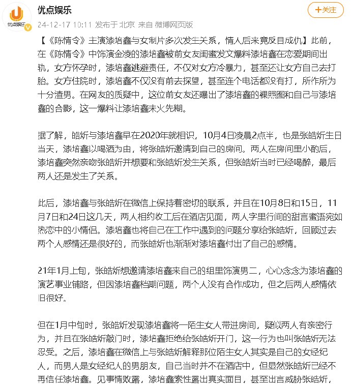 先说说两位主角。男的,漆培鑫,演过《陈情令》,小有名气;女的,张皓炘,圈内制片人,人脉资源那是杠杠的。两人是怎么认识的呢?据说是在行业聚会上,一见钟情?还是一拍即合?这咱就不知道了,反正后来两人走得挺近的。