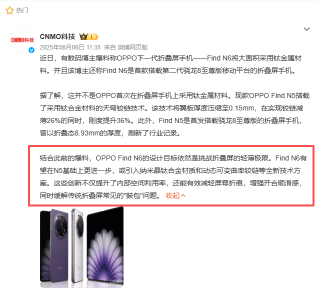 前段时间就已经有博主透露了,OPPO新一代折叠屏Find N6在UFG柔性玻璃取得了新突破,有望抢先苹果实现真正的“无折痕”折叠体验,而且可能还会引入纳米晶钛合金材质和动态可变曲率铰链等全新技术方案,真正把折叠屏做到“轻巧便携,折叠无痕”。