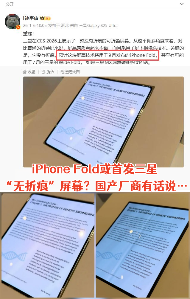 最近看新闻,三星已经在CES 2026上展示了一款没有折痕的可折叠屏幕,不仅屏幕素材不错,而且还采用了屏下摄像头技术,预计这块屏幕技术将会用于9月发布的iPhone Fold身上!!!