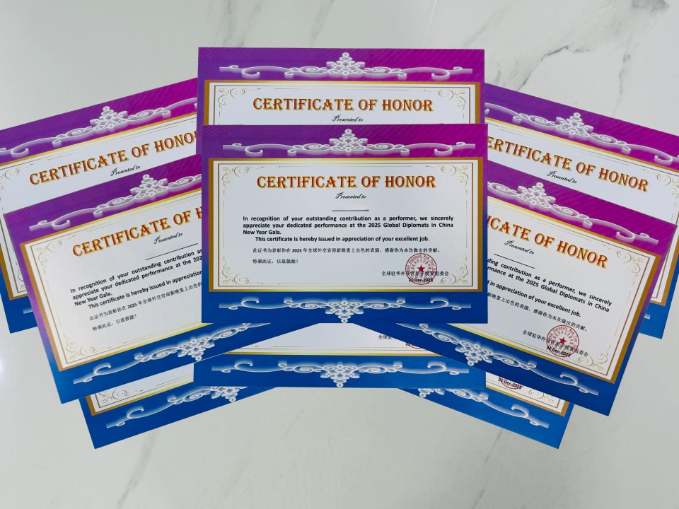 活动上,乐维艺术团收获了来自主办方的高度认可——由全球驻华外交官新年晚宴组委会颁发的官方认证证书。这份证书不仅是对团员们精湛艺术水准的嘉奖,更是对其在重大外事活动中成功传播中国青少年文化形象的官方肯定。