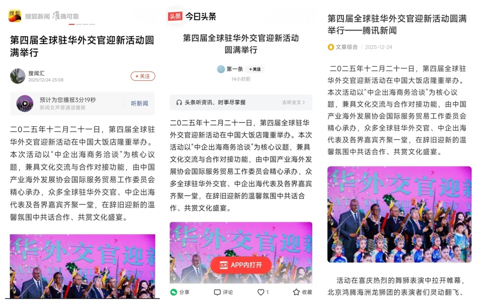 本次2026全球驻华外交官迎新晚活动的高规格与广泛影响力,吸引了包括网易、腾讯、搜狐、今日头条等在内的多家主流媒体进行现场报道。它们从“经济合作桥梁”与“人文交流纽带”等多重角度进行解读,将这场盛会的声音传递至全国乃至世界。