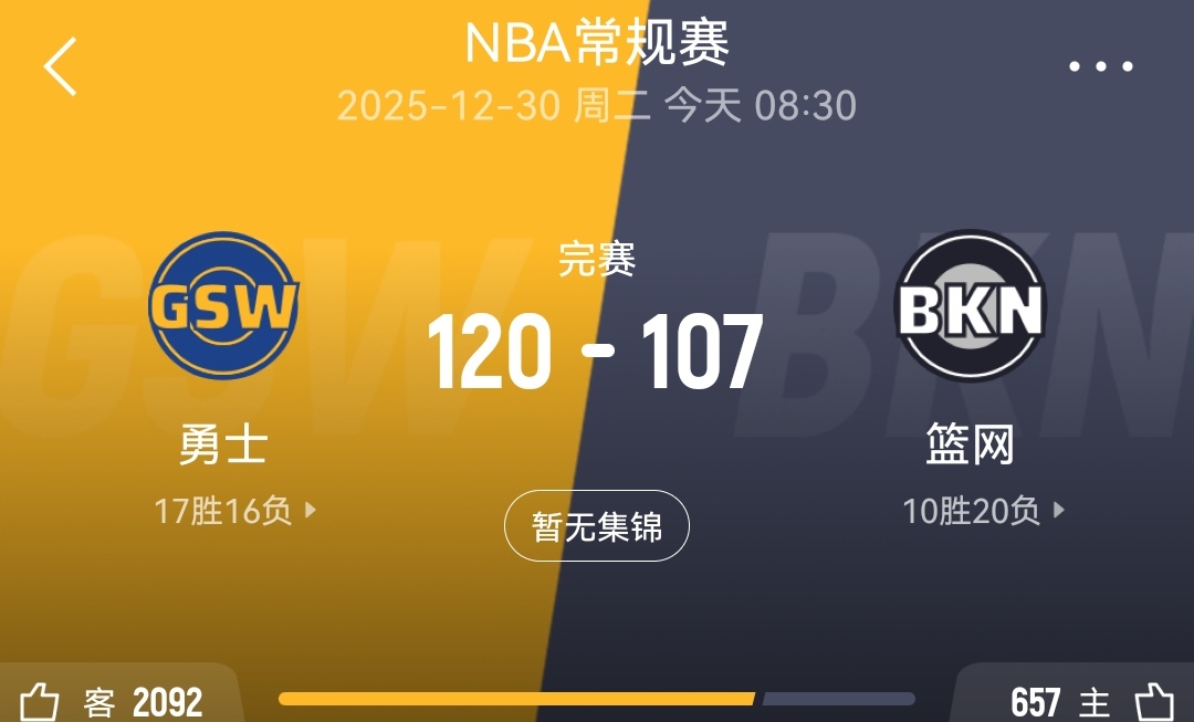 最后两分钟,勇士再次发动进攻,库里、巴特勒、理查德接连命中,就此比分拉开。本场比赛结束,勇士120-107战胜篮网。自己拒绝连败的同时,篮网3连胜也终结。