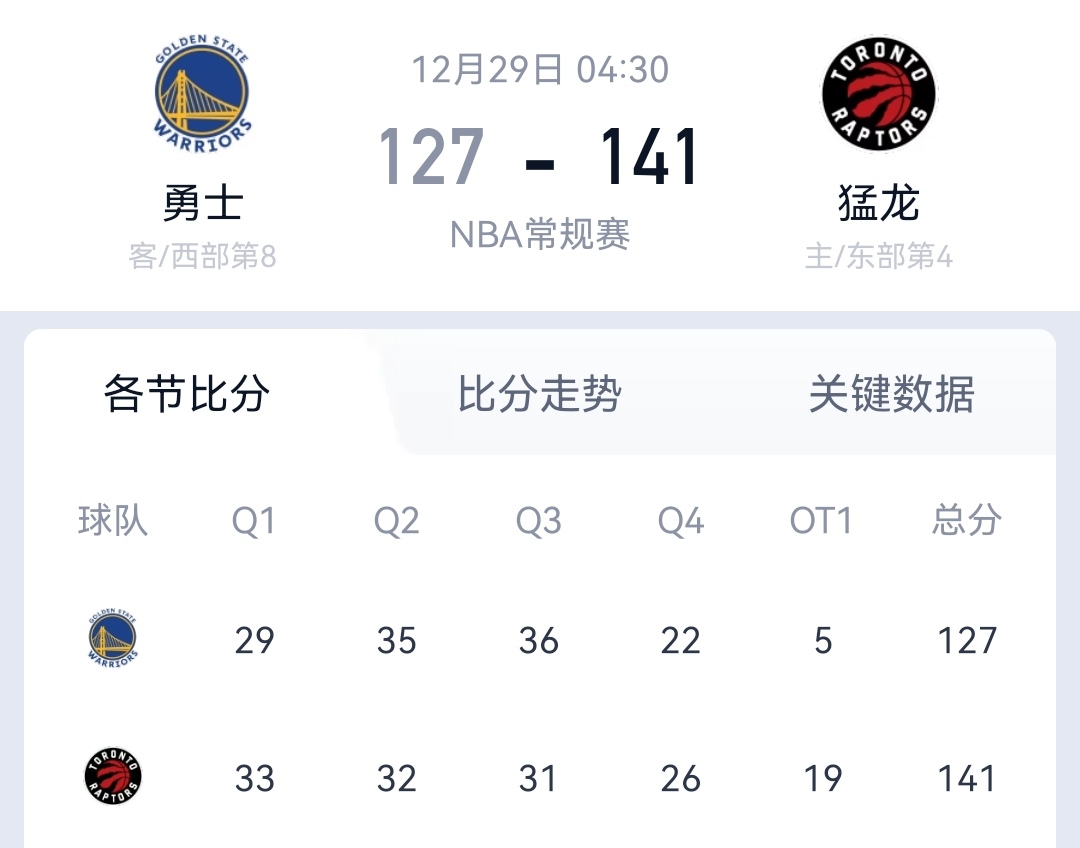 昨天他们客场加时赛127-141惜败给多伦多猛龙,球队的三连胜戛然而止。库里本场比赛依然发挥出色,在41分钟的出场时间里,他30投12中,三分球11中4,罚球11中11,砍下全场最高的39分。