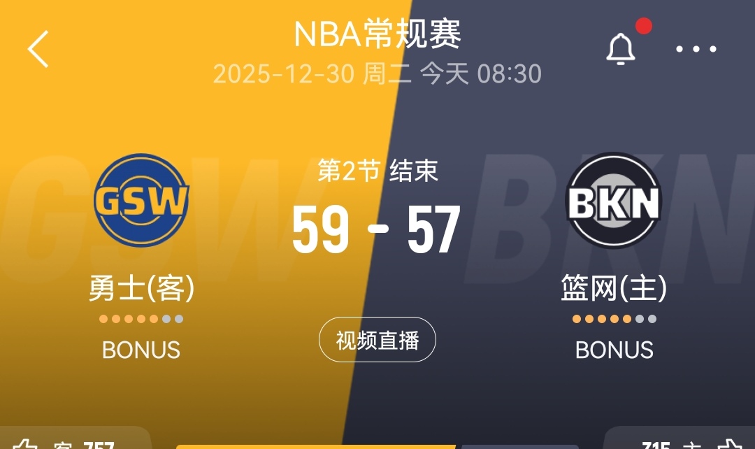 半场战罢,勇士59-57领先主队篮网2分。比分来看,双方得分都挺高,前两节算是超常发挥了。单节比分,勇士31-27。