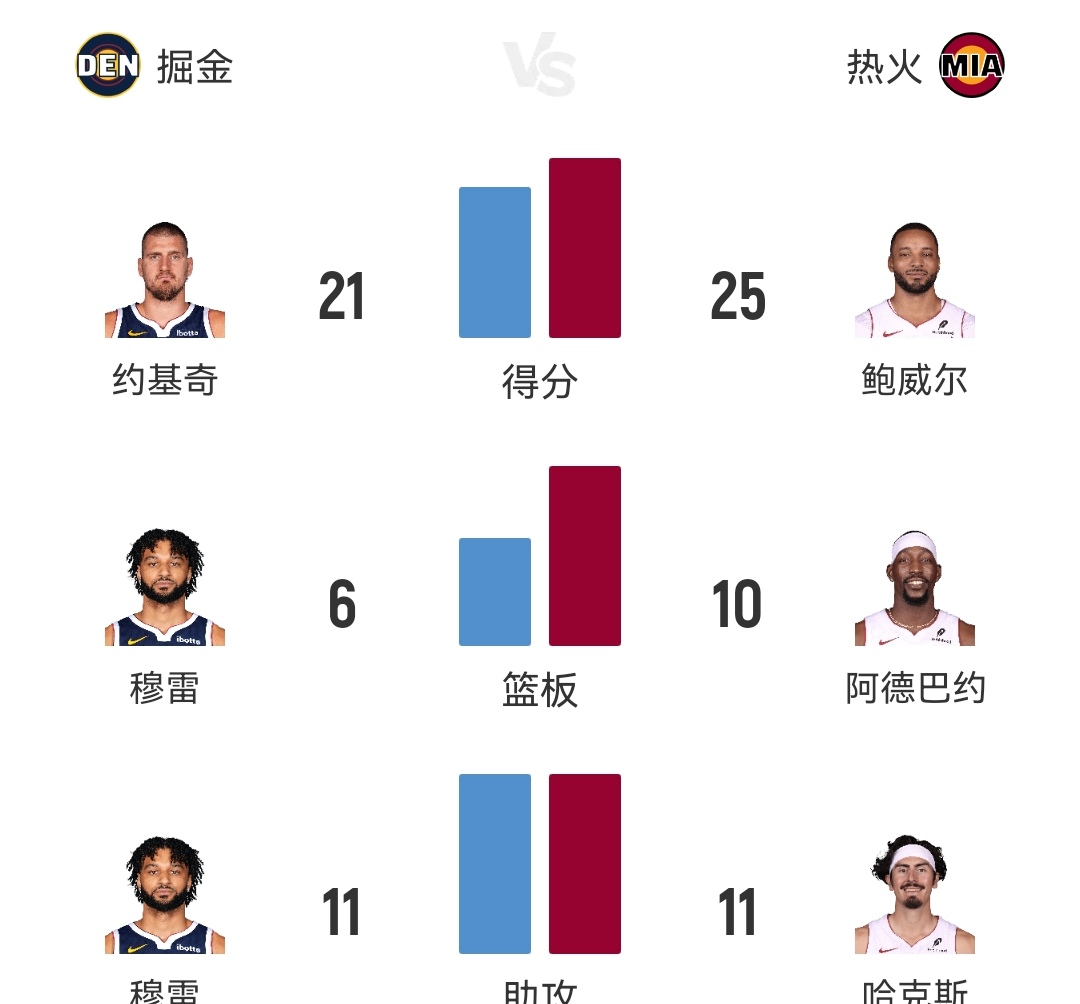 热火方面:8人得分上双,鲍威尔25分,约维奇22分,哈克斯20分,威金斯19分,威尔19分,史密斯11分,米切尔10分。