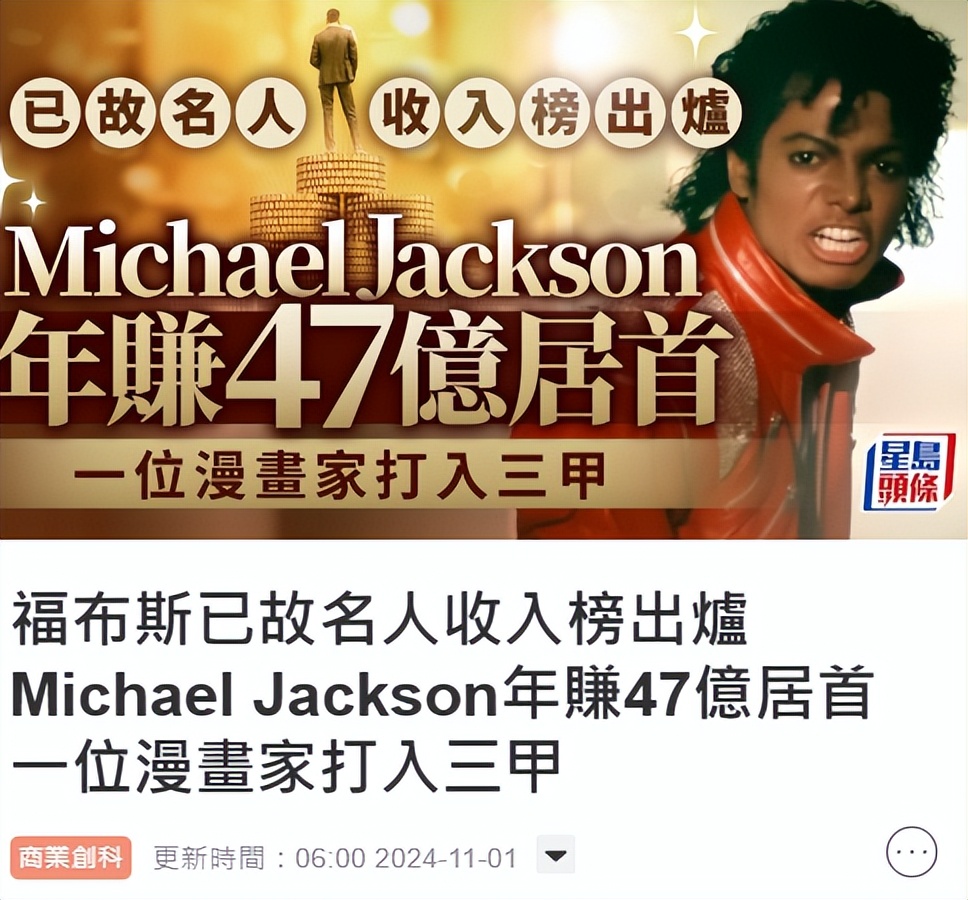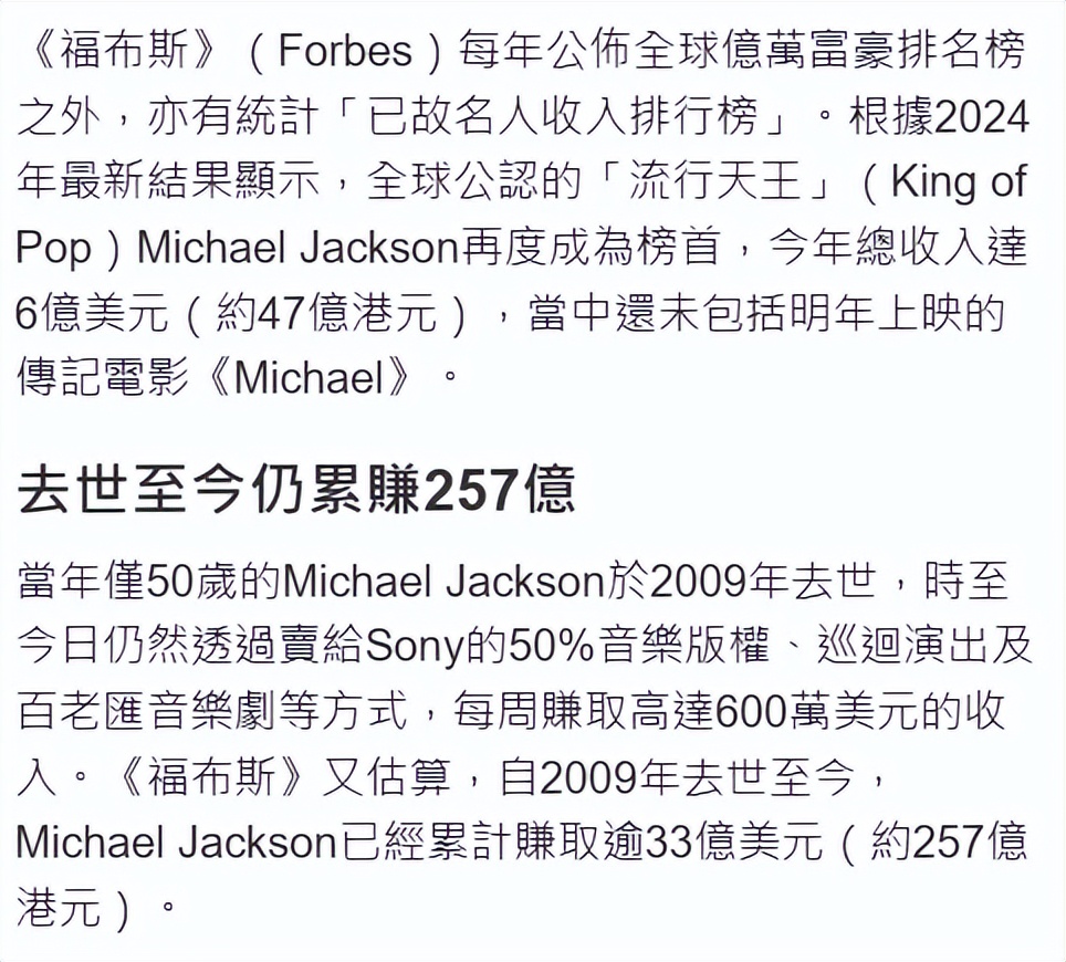 而且这一数字正在上涨,因为MJ的纪录片《Michael》将在明年4月上映,该片由MJ的侄子Jaafar Jackson担任主角,MJ所关联的版权公司将从中抽取税金。