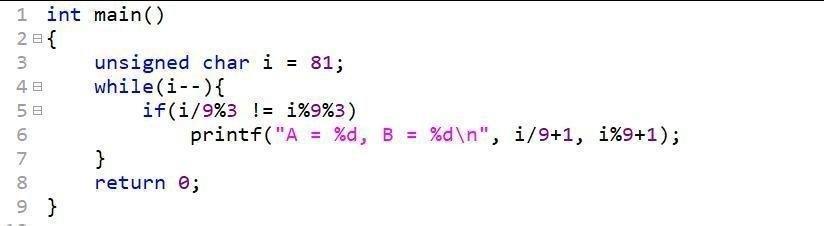 问题的本身并不复杂,只要把所有A、B 互相排斥的条件列举出来就可以完成本题的要 求。由于本题要求只能使用一个变量,所以必须首先想清楚在写代码的时候,有哪些信息需 要存储,并且尽量高效率地存储信息。稍微思考一下,可以知道这个程序的大体框架是: