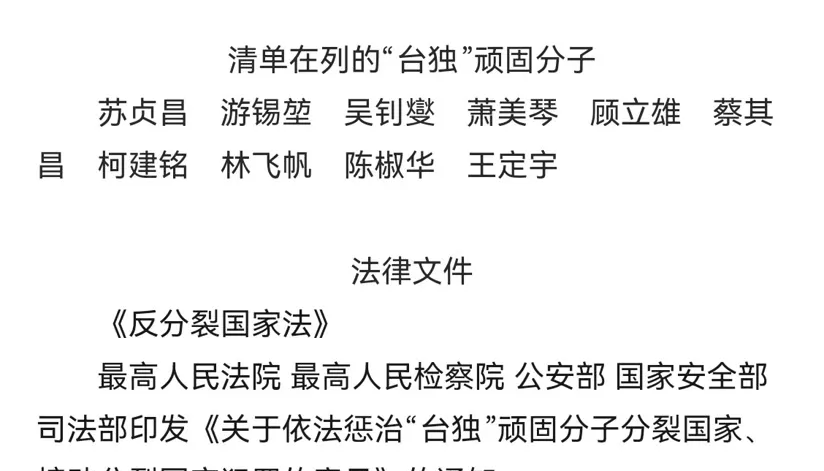 国务院台办网站新增了“依法惩治‘台独’顽固分子”专栏,公安部政府网站也新增了“依法惩治‘台独’顽固分子”专栏。