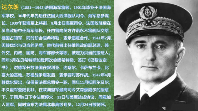 1942年12月24日圣诞夜,曾经的法国维希政府二号人物,刚刚转投盟军的法国海军上将弗朗索瓦·达尔郎被法国极端君主主义者刺杀。很多人都认为幕后主使是丘吉尔,但是没有足够证据。