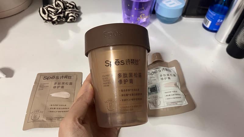 诗裴丝这款发膜的香型表现一般,第一次用花果香平平,直到睡前抹完贴枕巾——半夜翻身闻着安心,没甜腻感,尾调檀木像老家具暖感。缺点是洗后第二天只剩淡香,技术上精油不是高浓的,遇水掉多,不过不刺激眼睛,比之前用的舒服。