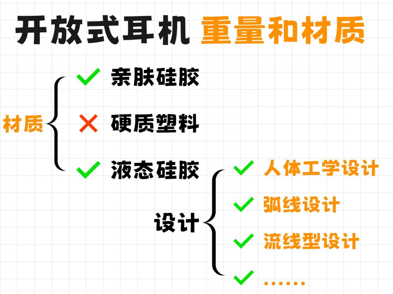 耳机重量对佩戴体验影响很大,尤其是长时间用的时候,1克的差别都会很明显。普通开放式耳机单只通常在12克上下,优质款能控制在10克以内。材质方面,大品牌常用钛合金记忆耳挂搭配硅胶外层,贴合各种耳型,佩戴更舒适亲肤,耳朵也不会有太大负担。