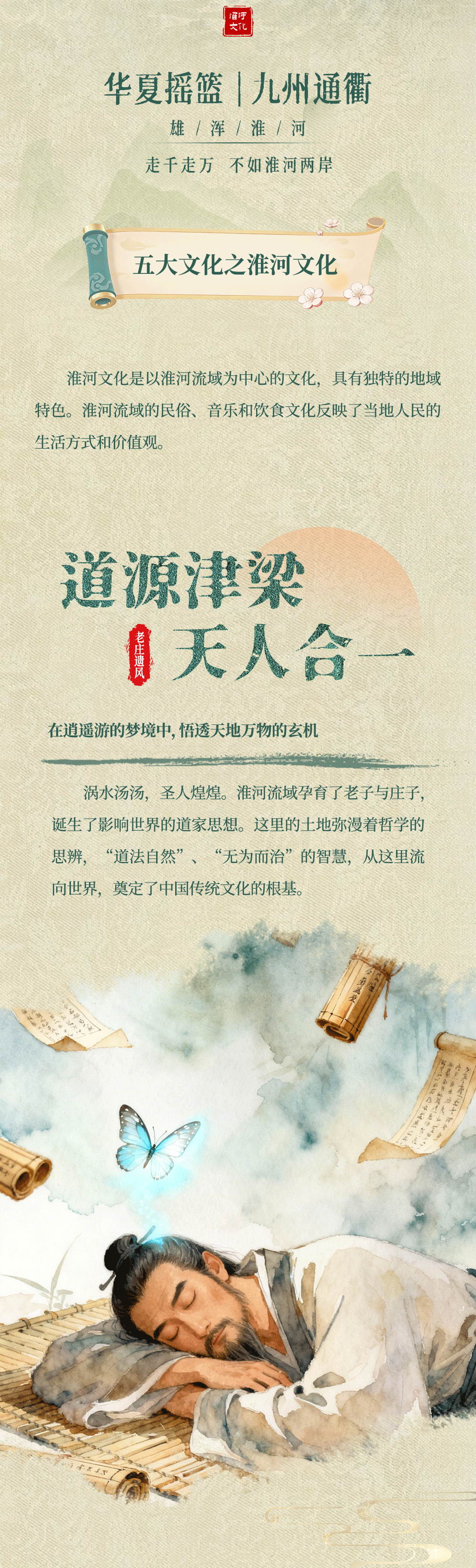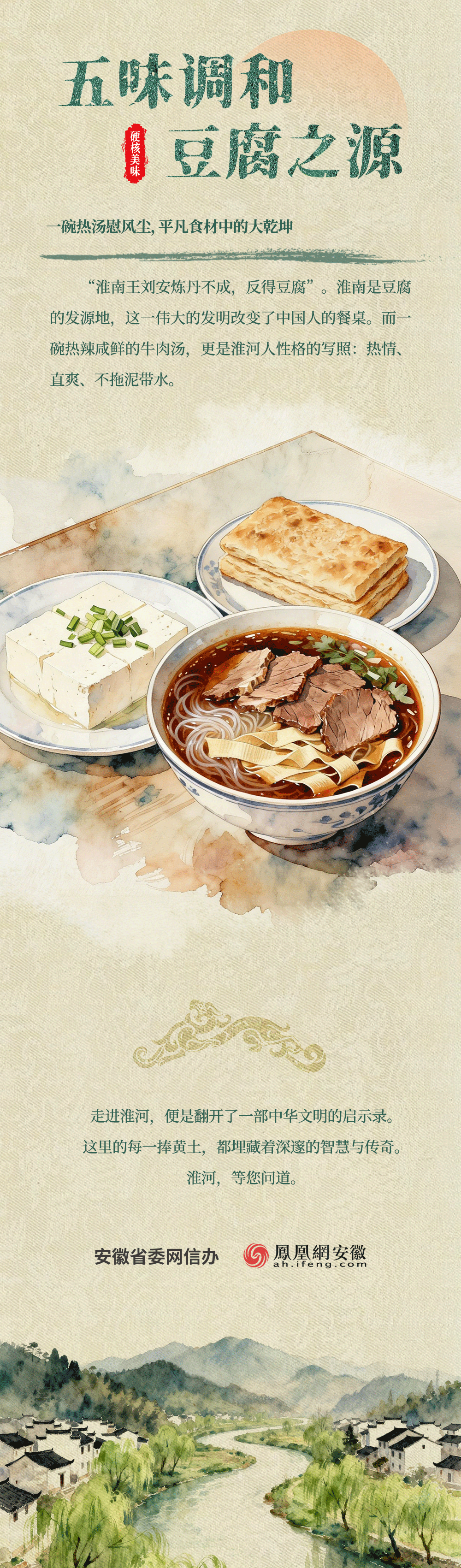 长淮穿境,纳百川之壮阔;道韵悠长,育千古之哲思。 AI视角下的淮河画卷生动流转——既有涡水之畔悟道的逍遥洒脱,亦有花鼓灯里舞出的皖北热血。这里是老庄哲学发源的“道之源”,也是彰显安徽性格、融合南北气韵的文化高地。让我们跟随长图纵览淮上风光,于八公山草木间读懂历史,在升腾的人间烟火里品味生活。