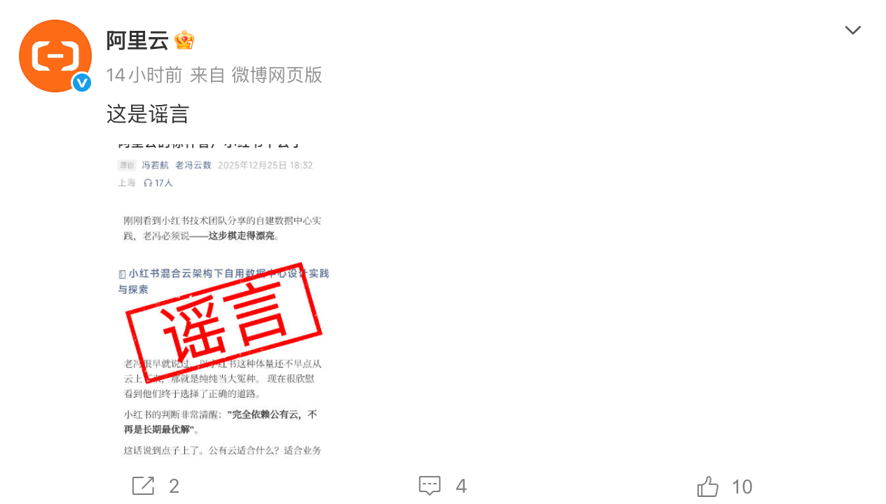 针对上述传闻,阿里云在社交媒体平台发文称:这是谣言。由此来看,小红书依然在使用阿里云提供的云计算服务。