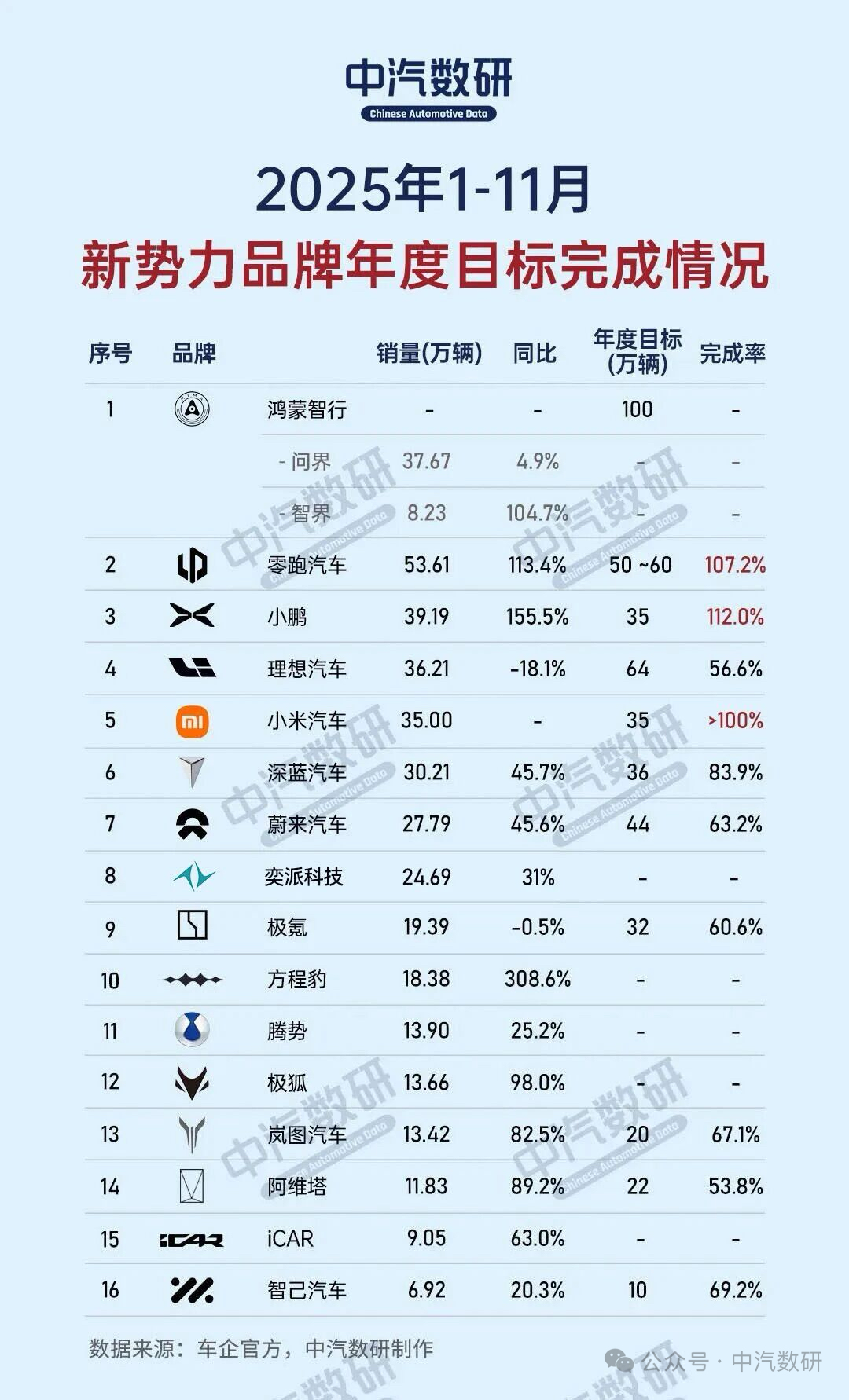 按照中汽数研公布的数据,深蓝汽车1-11月的年度目标完成率为83.9%,在新势力品牌中表现尚可,如果基于11月的销量规模以此推测,完成36万的目标具备可能性。