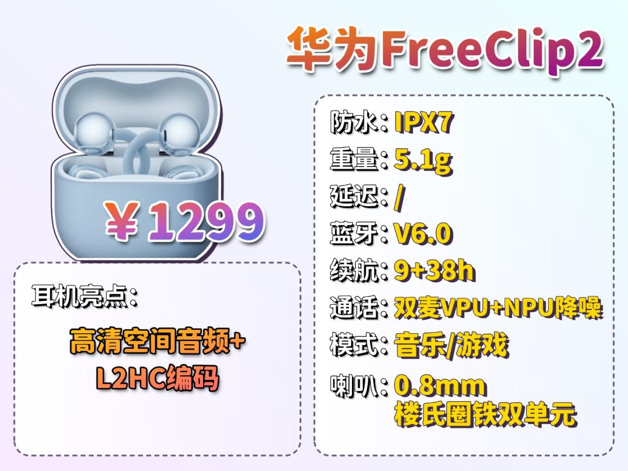华为FreeClip2在音质上采用10.8mm双擎单元,确保声音拥有饱满的基底与充沛的细节表现;高清空间音频技术能营造出开阔且定位精准的声场,增强聆听时的沉浸感;搭配华为设备还能开启L2HC高清编码,实现更高质量的音源传输,让人声通透、乐器分离清晰,整体听感均衡细腻。佩戴上运用云感C形桥与亲肤液态硅胶,配合记忆金属实现轻盈且稳固的贴合,长时间佩戴依然舒适。性能上支持IPX7级高强度防水,无惧汗水和雨水侵扰;双麦VPU+NPU智能通话降噪确保通话清晰;续航持久并支持一拖二连接。