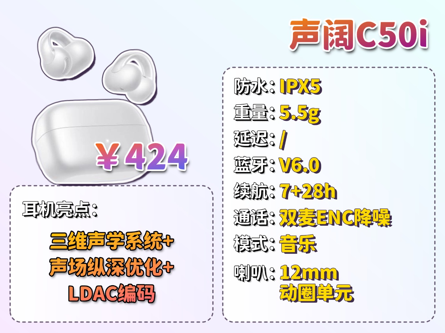 声阔C50i在音质上搭载12mm动圈单元,提供了清晰扎实的中频与有弹性的低频基础;三维声学系统增强了声音的立体环绕感,听歌时更有氛围;声场纵深优化技术进一步拓展了声音的空间层次;同时支持LDAC高清编码,能保留更多音乐细节,整体听感饱满且层次分明。佩戴上采用柔性力学架构与人体工学设计,5.5克机身贴合稳固,但舒适性一般,长时间使用耳部会有压迫感。性能上具备双麦通话降噪,日常通话清晰;支持IPX5级日常防水;续航可满足全天使用需求。