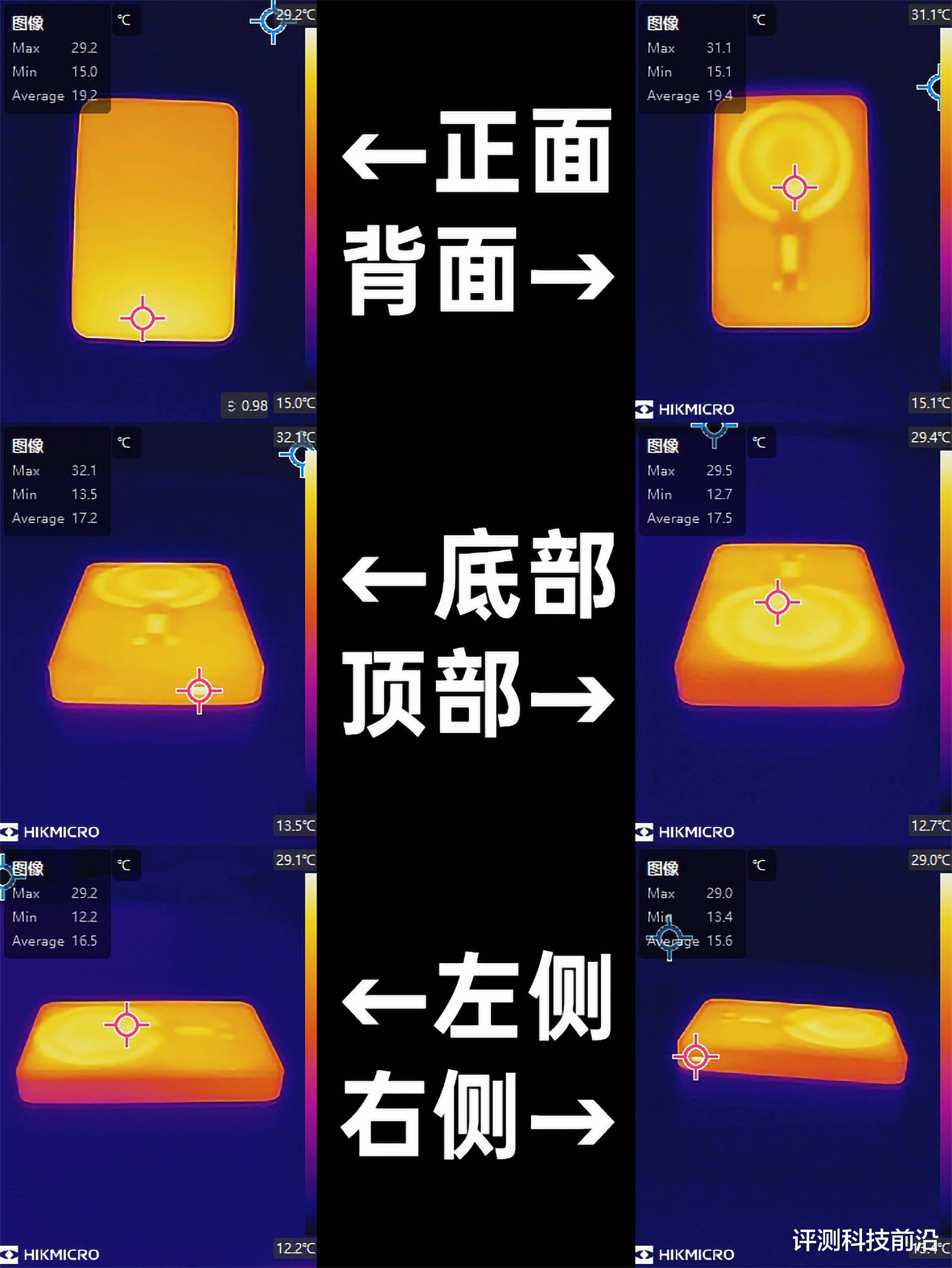 ▼用无线充电给手机连续充电30分钟,可以看到得益于全金属的机身,热量分布非常均匀,散热面积大,散热效率高,表面最高温度也就31.1℃,手摸着没有明显热量,接口处最高温度也就32.1℃,温度控制还是不错的