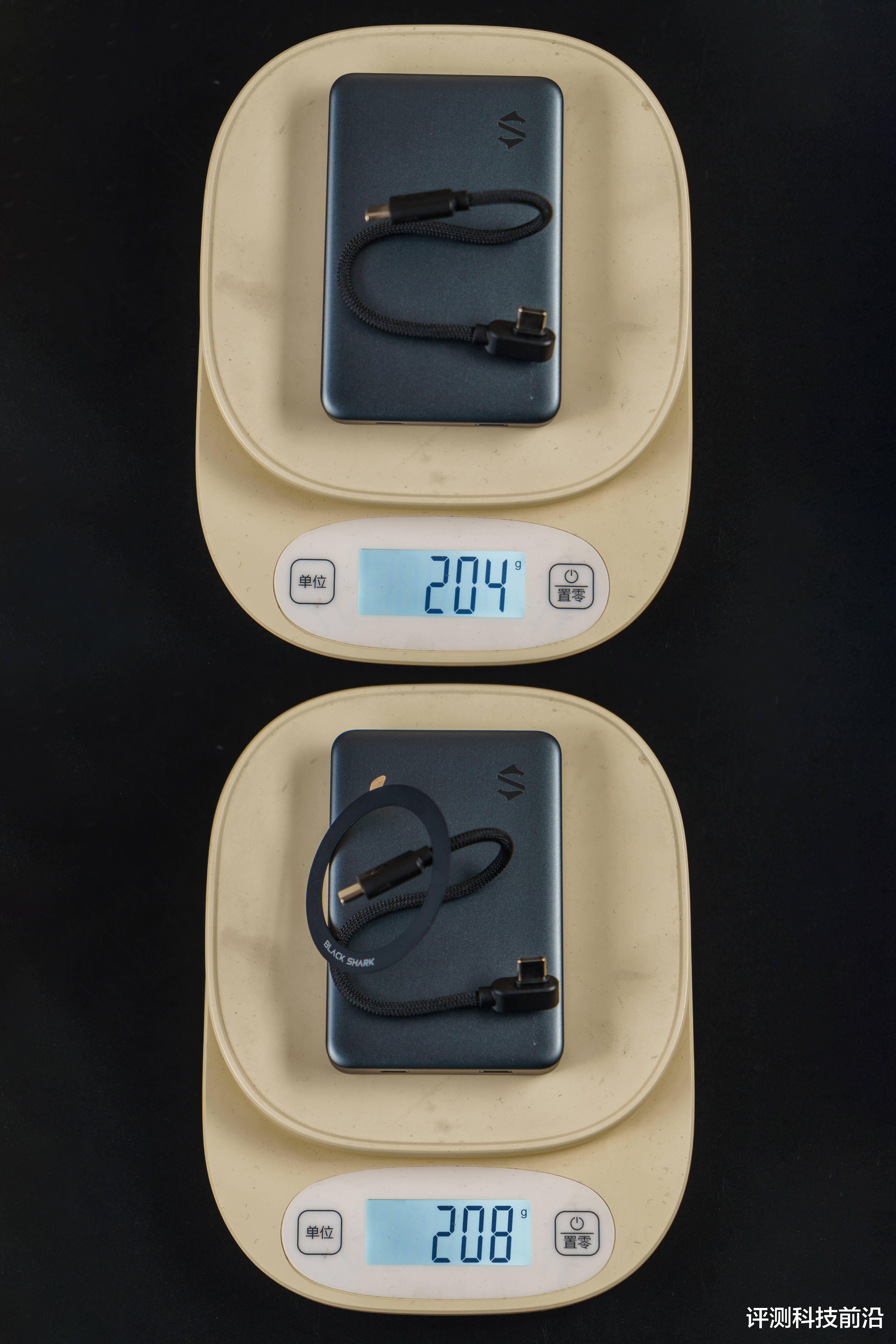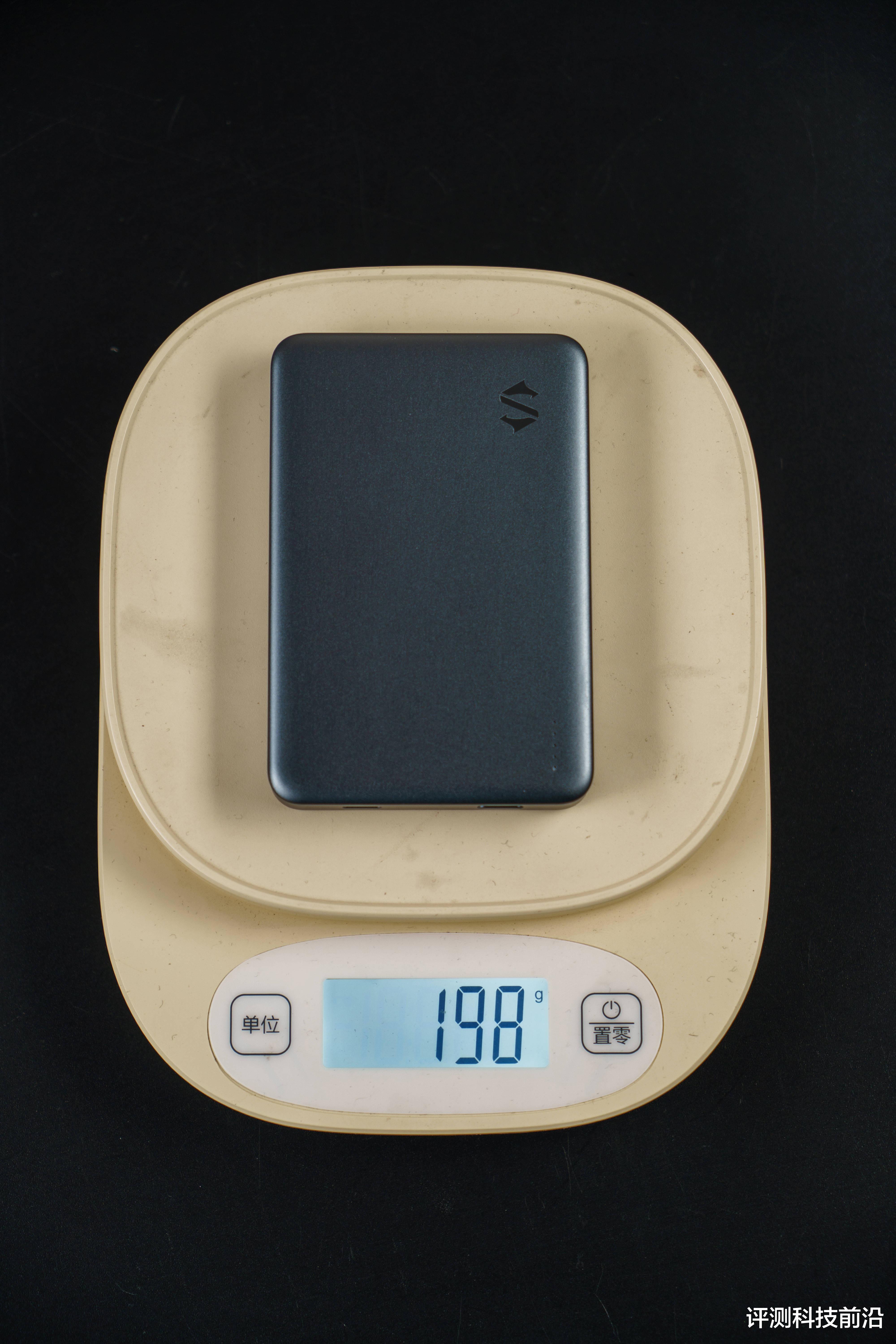 ▼称一下重量,单充电宝大约为198克,加上自带线约为204克,再加上引磁片约为208克