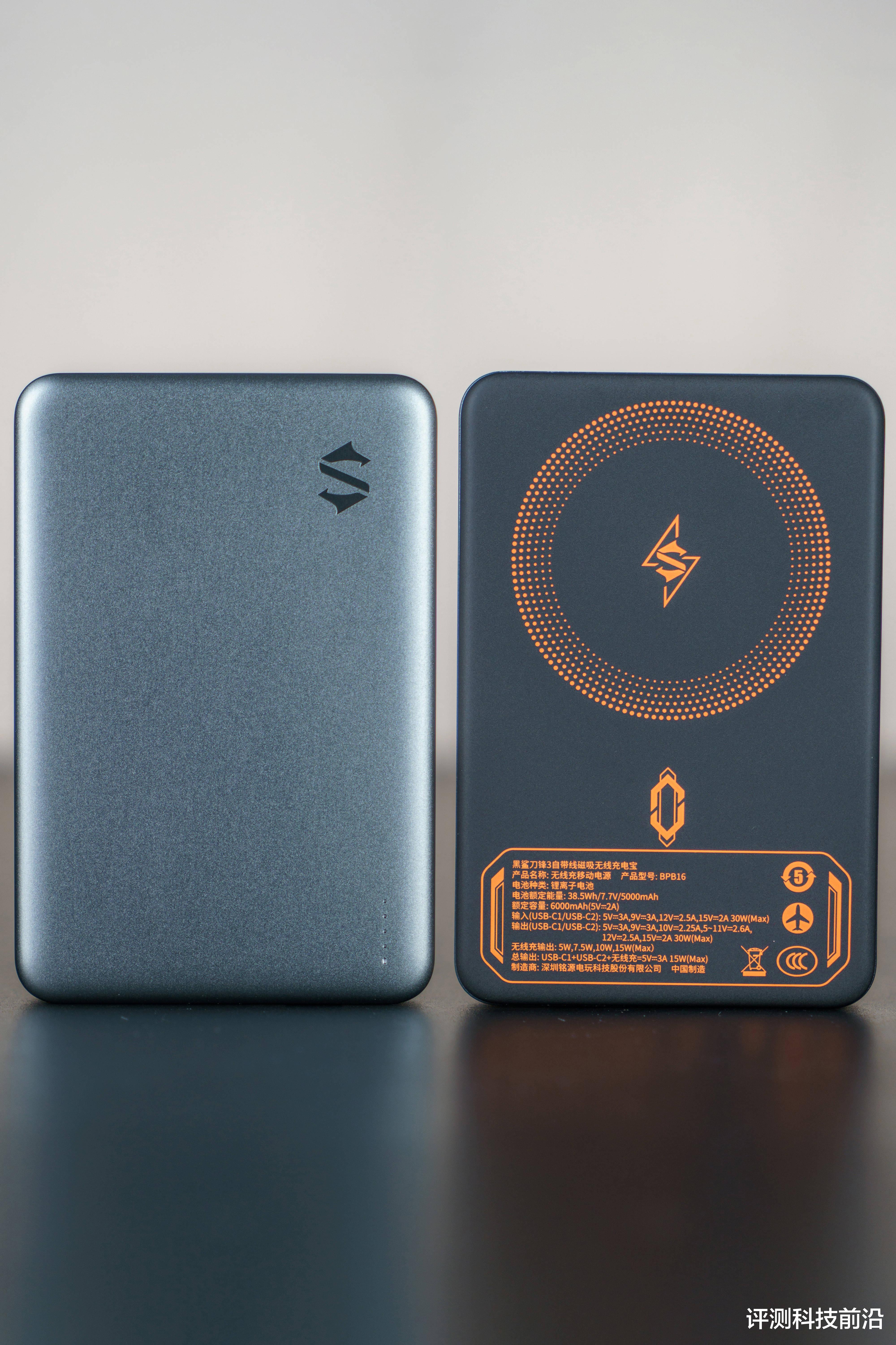 ▼它有两种配色可以选择,我手里的这款是黑耀橙,充电宝外壳为采用阳极氧化工艺处理的Macbook同款5系铝合金材质,质感很顶;正面右上角为“烧青工艺”处理的黑鲨LOGO,更耐磨,正面右下角为LED指示灯;背面则是机甲风格的印刷,这层印刷都经历了三涂三烤工序,触感更加细腻温和,不会对手机背面产生磨损,通过印刷标识可以清楚看到它是可以上飞机的,也通过了3C认证,这是目前大家购买充电宝产品最关心的两点,容量为10000mAh,由两颗5000mAh的防爆高密度钴酸锂电芯组成,这种电芯就算经过穿刺、挤压等非常极限的暴力测试,依旧不会爆炸和漏液,安全性在充电宝里应该是第一梯队了;一面极简风一面机甲风,这样的设计挺独特