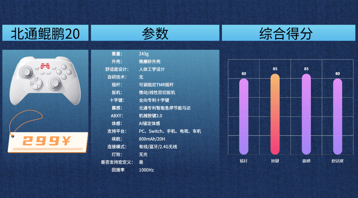 它的整体采用是类似于纯白的配色,独特的"北通纹"设计增强防滑抗指纹性能,但外壳塑料感较强,且体积偏大,18cm以下手型可能握持不适。扳机键支持在0.3mm微动短行程、8mm线性长行程间模式切换,还带有扳机震动。手柄的ABXY键设计成圆润突出的小圆豆造型,70gf按压力度与0.3mm精调键程做到了随心应手触发,整体的按键手感柔和回馈清晰不粘手,游戏时精准度极高。这个多向摇杆支持5400+分辨率、无级阻尼调节可适配不同游戏需求。摇杆帽耐磨一般,5 小时《喷射3》就见明显磨痕,建议先贴防刮胶带。唤醒逻辑偏“佛系”,得晃 3-5 秒才回连,急性子直接按 Home 更快。