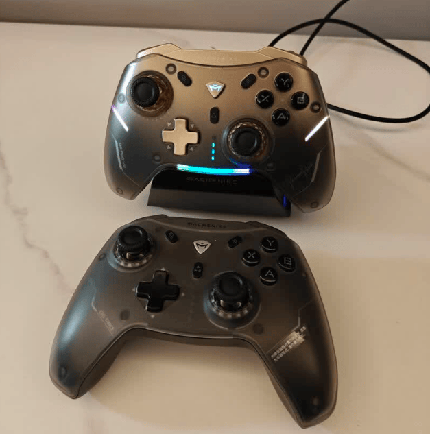 摇杆灵敏与稳定性属于“好上手”的区间,按键整体回弹清晰,敲击体验比较舒适。肩键与扳机分布偏向竞速、射击、球类玩法,尤其搭配线性扳机时,赛车类游戏的油门控制会更细腻。基础体验方面也比较稳妥:固件优化后连接更稳定;两节AA电池正常可支撑约30小时游戏;蓝牙模式偶尔能感到一点延迟,但休闲玩家基本可以忽略,对响应极其敏感的用户搭配官方无线适配器就能解决。