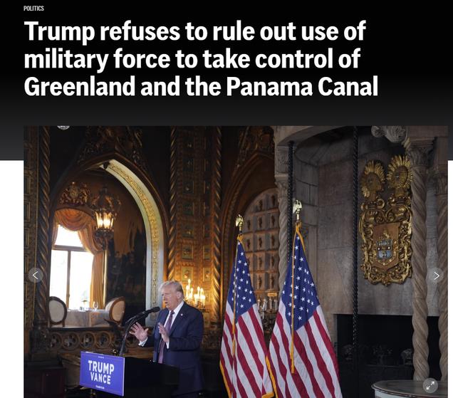 特朗普拒绝排除使用军事力量控制格陵兰岛和巴拿马运河的可能性
