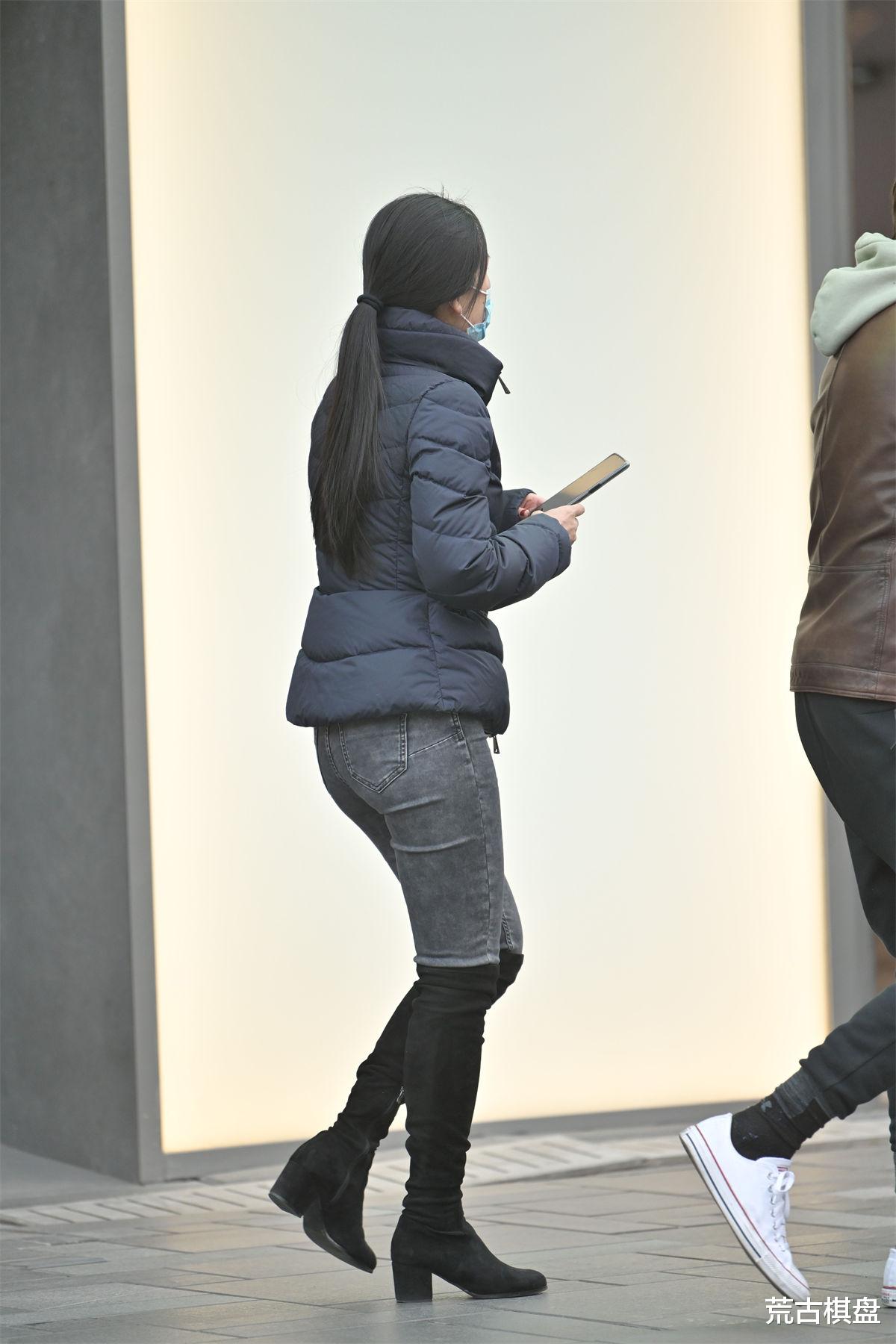 紧接着,我们来看看这条浅灰色紧身牛仔裤。作为四季皆宜的经典单品,紧身牛仔裤以其百搭性和塑形效果深受喜爱。浅灰色调在冬日里显得格外清新,与黑色长靴形成了鲜明的层次感,既不会过于张扬,又能巧妙地提亮整体造型。高弹面料紧密包裹着双腿,无论是O型腿还是X型腿,都能在这双“魔法裤”下瞬间变得笔直修长。裤脚轻轻塞进靴筒中,既保暖又时尚,完美衔接了上下装,让整体穿搭更加流畅和谐。