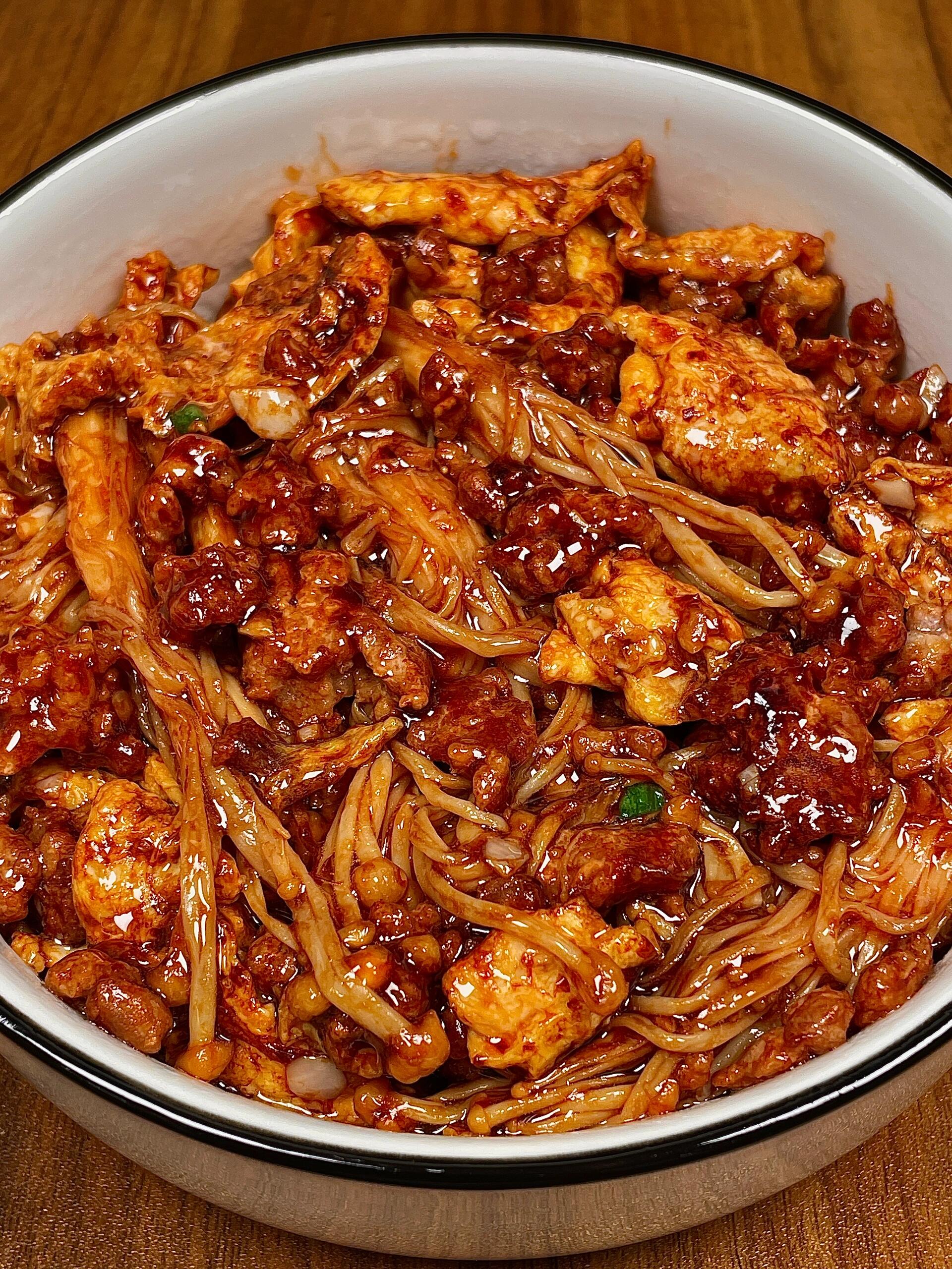 端上桌,舀一大勺盖在热米饭上。酱汁慢慢渗进米粒的缝隙里,金针菇滑溜溜地挂在饭上,鸡蛋碎裹着肉末藏在其中。送一勺进嘴里,先是鸡蛋的香,接着是肉末的浓,最后金针菇带着些许脆爽的汁水在齿间绽开——层次分明又浑然一体。这时候哪里还顾得上说话,只管埋头扒饭就是。