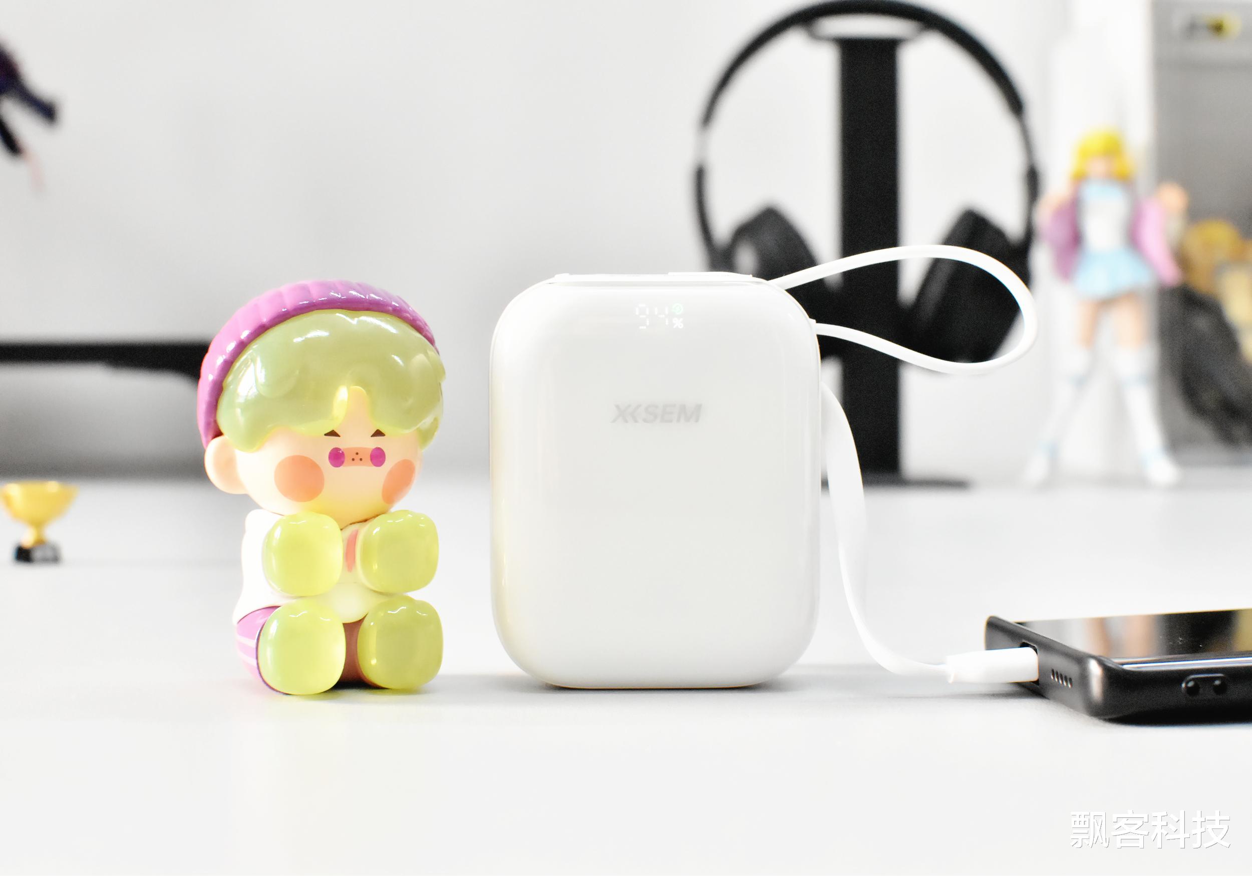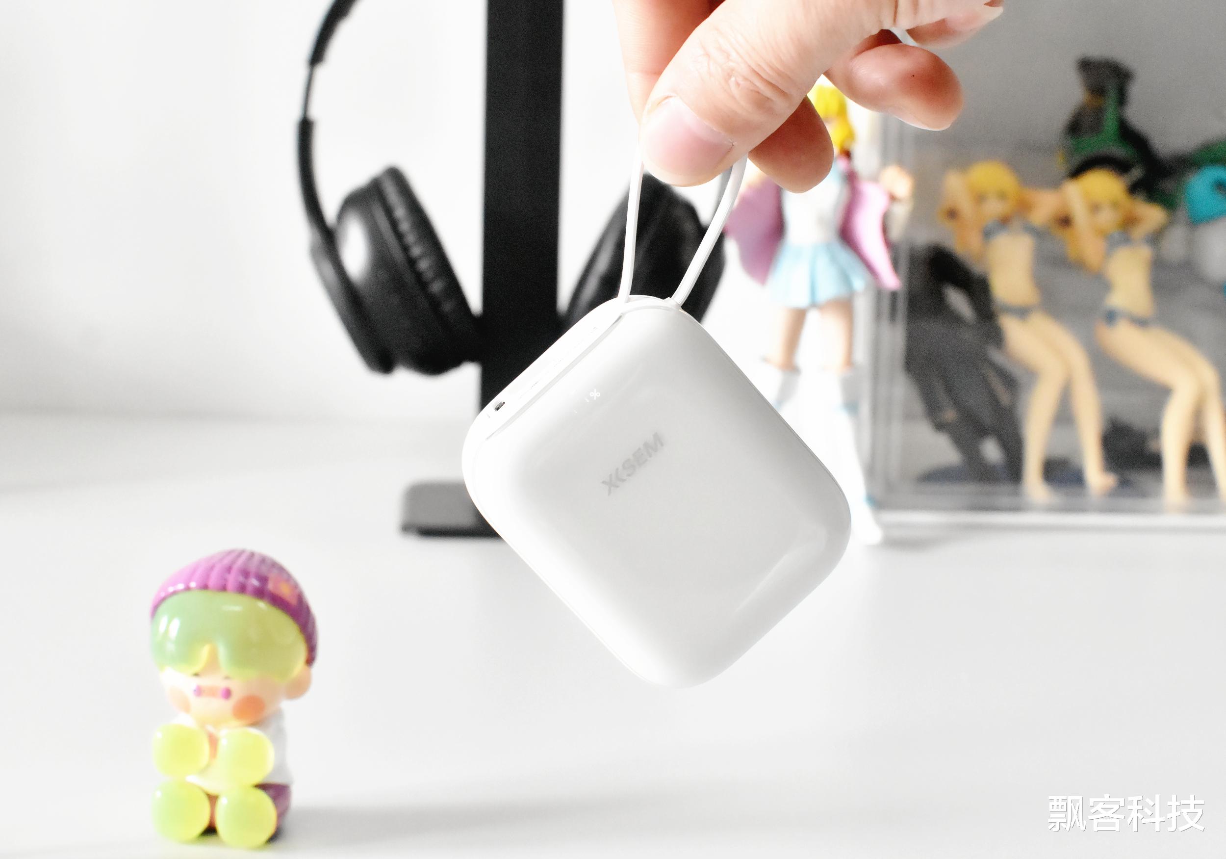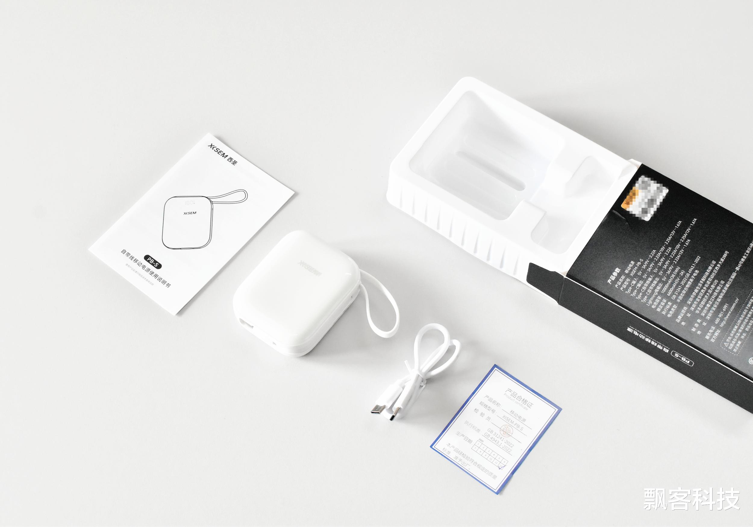 西圣PB S的体积比预想的还要小巧,机身尺寸为:长74.5mm、宽60mm、高28.4mm,重量仅179克,自带lighting和Type-C双充电线,意味着日常出门几乎不用额外带线,对苹果用户和安卓用户都很友好。