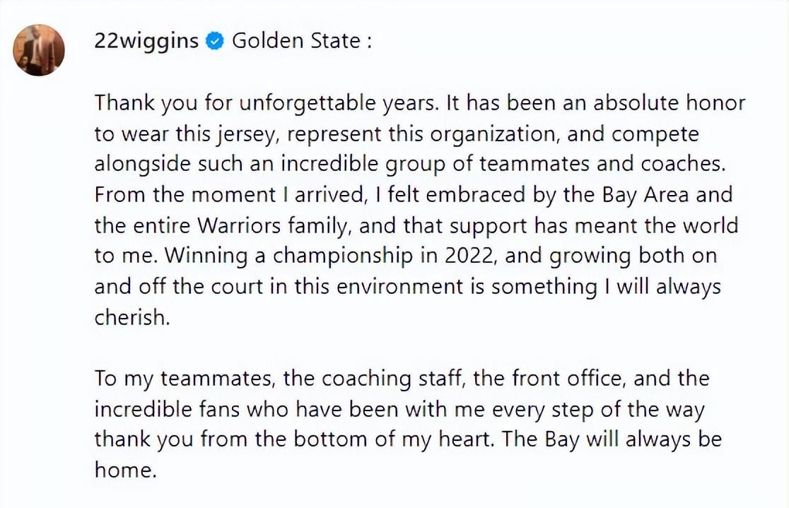 维金斯在社交媒体上发了个告别视频,里面有他捧着总冠军奖杯的画面,看着挺感人的,毕竟在勇士的日子对他来说意义非凡。他在告别信里写道感谢勇士给他带来难忘的岁月,能穿上勇士的球衣和那么优秀的队友一起打球,他觉得很荣幸。从刚到勇士的时候,他就感受到了湾区球迷的热情,这种支持对他来说意味着很多。2022年赢得总冠军,还有在勇士不断成长的经历,都是他永远会珍惜的回忆。他还特别感谢了队友、教练组、管理层和一直支持他的球迷。