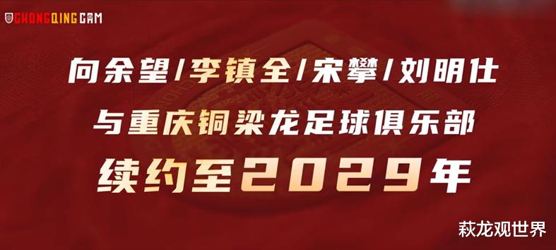 中超俱乐部都别惦记了!铜梁龙续约四大重庆崽儿!3月9日,重庆铜梁龙俱乐部官宣,向余望、李镇全、刘明仕、宋攀与俱乐部续约至2029年。重庆铜梁龙官方发文这样写道:“重庆崽儿!就为重庆Goal Goal Goal!向余望、李镇全、刘明仕、宋攀与重庆铜梁龙续约至2029年!”重庆球迷表示:非常棒!重庆雄起!
