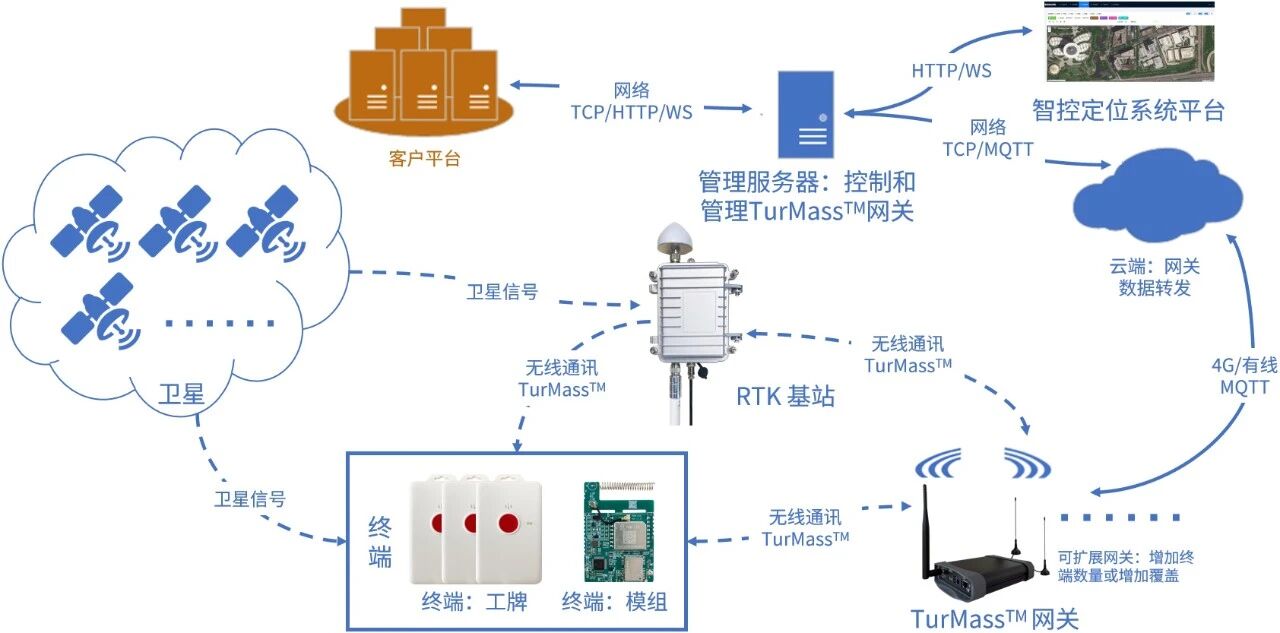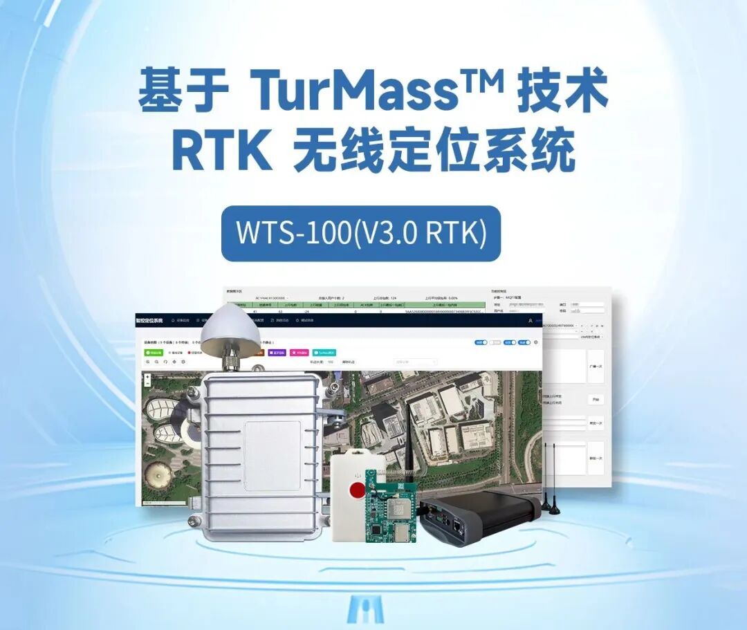 WTS-100(V3.0 RTK) 主要由 RTK 定位终端、RTK 定位基站、TurMass™ 网关、TurMass™ 管理服务器、智控定位系统平台等构成,依托 RTK 基站实时接收卫星信号并计算误差参数,生成差分校正数据,再经 TurMass™ 无线模组将数据传输至 RTK 定位终端,将状态信息传输给 TurMass™ 网关;RTK 定位终端同步接收卫星信号与校正数据,结合载波相位与伪距信息消除公共误差,得到厘米级高精度定位结果,随后通过 TurMass™ 无线模组将定位结果发送到 TurMass™ 网关,再经过管理服务器服务处理,在智控定位系统平台实时展现,或将数据推送到应用层,在客户应用平台实时展现。