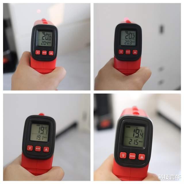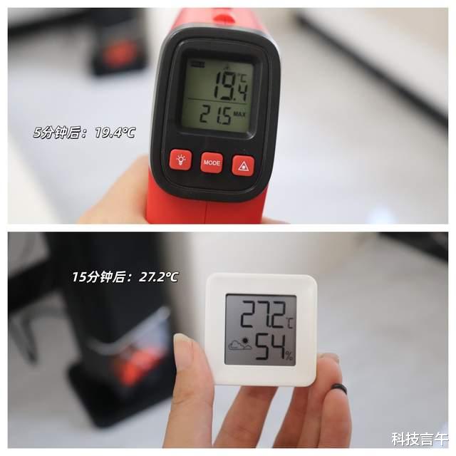 实测升温速度更让我惊喜。我在20平米的卧室测试,开机5秒就能感觉到热风出来,15分钟后,红外测温仪显示室温从19.4℃升到27.2℃,所以升温速度还是很快的。
