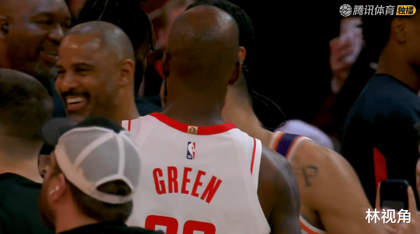 比赛结束,双方球员很友好,在场上互相拥抱致意,杰伦格林也走入场内,和老队友拥抱聊天,狄龙更是找到乌度卡,两人笑嘻嘻拥抱致意,看起来都很开心。