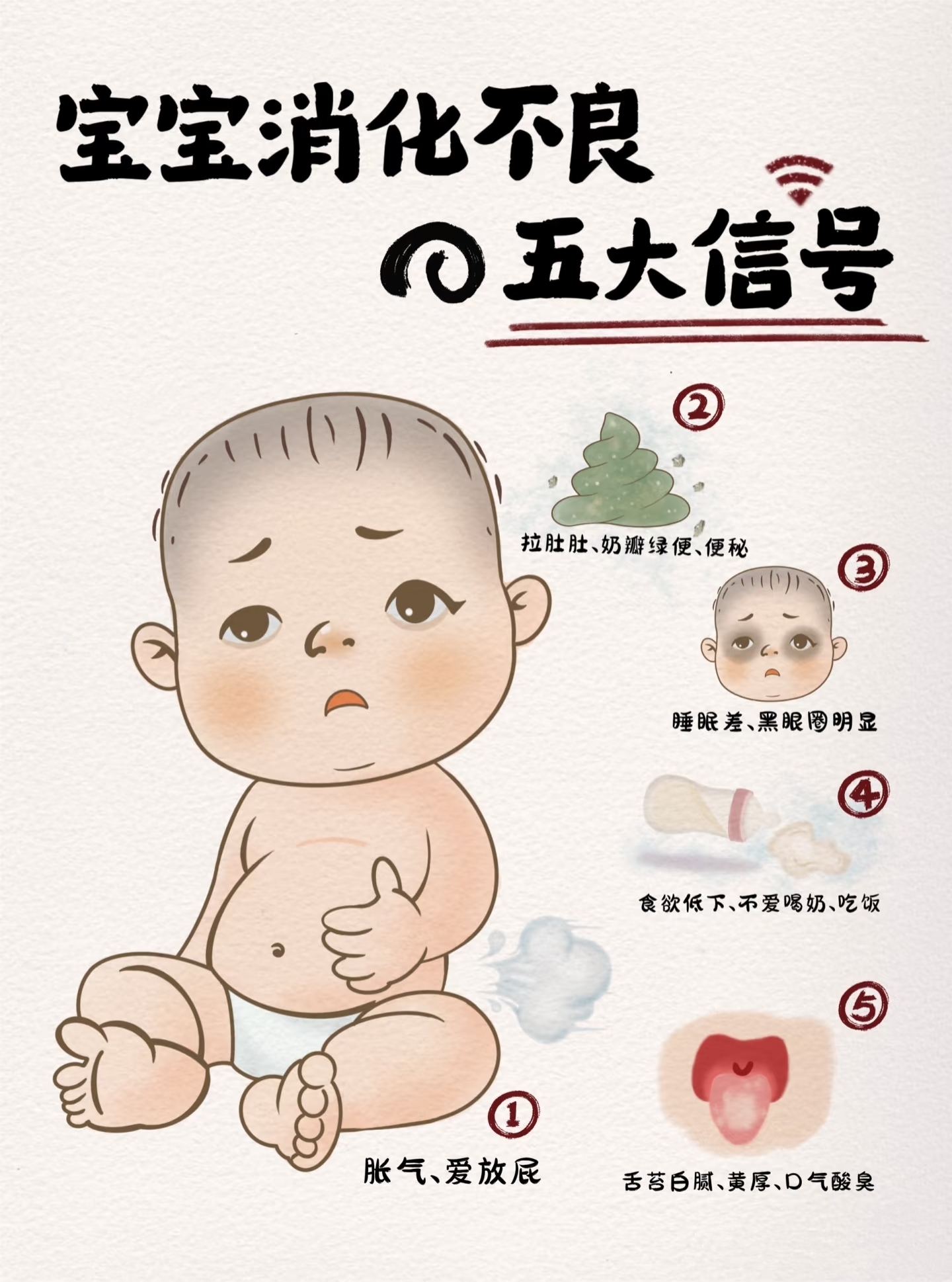 别看宝宝不会说话,他们的身体可是很诚实的。出现以下这5种情况,就要警惕消化不良了: